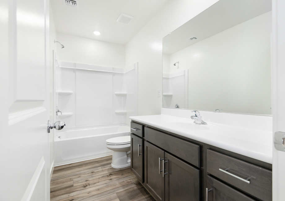 If you’re searching for a spacious layout with incredible upgrades, look no further than the Stafford plan at Bisbee Ranch! The downstairs layout features an expansive family room connected to the dining area and chef-ready kitchen. You will love cooking in the Stafford kitchen with an oversized island, sprawling granite countertops, and full suite of stainless steel Whirlpool® appliances. Upstairs, you’ll find the private master suite, four additional bedrooms, and extra storage space. Start living your best life today in the Stafford plan at Bisbee Ranch!