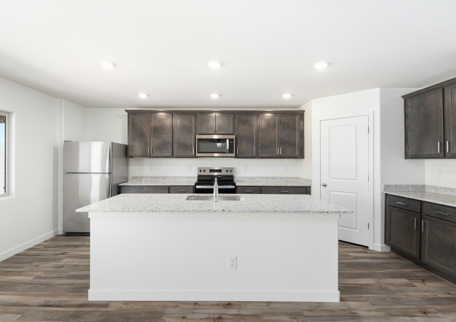 The Stafford at Bisbee Ranch showcases an incredible kitchen designed to enhance the time you spend preparing and serving meals. Sprawling granite counters provide a beautiful workspace to prepare food and plenty of room to display appliances and gadgets. Gorgeous wood cabinets topped with crown molding ensure everything will have a place within reach of the family chef – including larger appliances, serving dishes, linens and more!