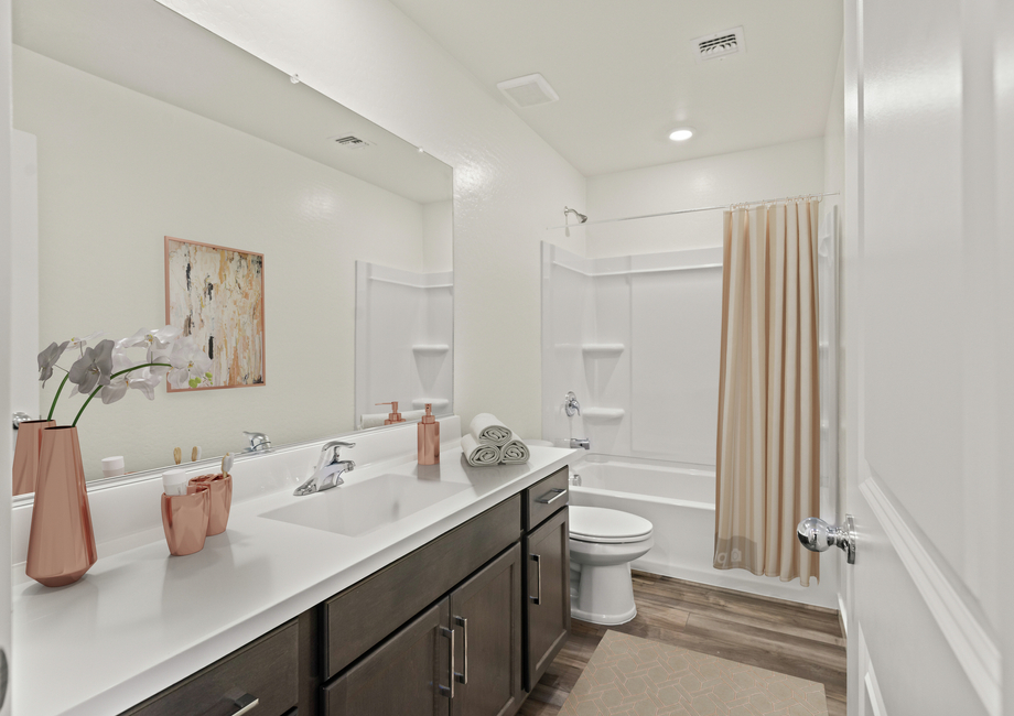 The kitchen of the Stafford plan is one of the biggest highlights of this home. With spacious granite countertops, designer wood cabinetry with crown molding, stylish vinyl plank flooring and a full suite of Whirlpool® kitchen appliances this home has thousands of dollars’ worth of upgrades already included in the price.