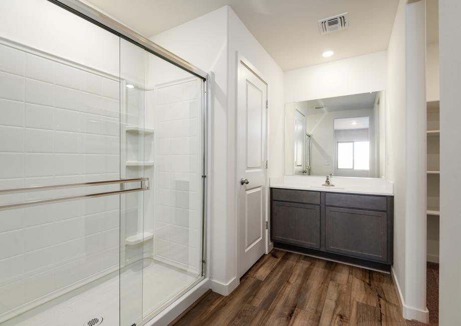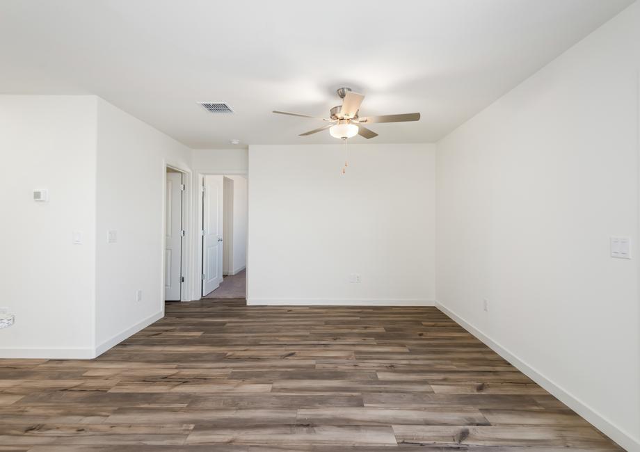 The living area of the Ash plan features a highly popular, open-concept layout. This layout is functional for any family with a kitchen overlooking the family room and dining area. You’ll never miss a moment with your family in the living space of the Ash at Red Rock Village.