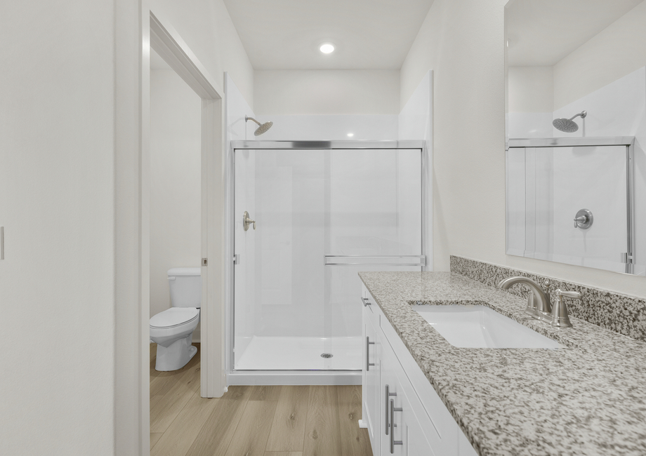 Experience ultimate relaxation in the sprawling master suite, tucked away for maximum privacy. Enjoy tranquil backyard views and a luxurious, spa-like master bathroom. The master bath features a beautifully designed vanity with ample countertop storage, an extended shower, and an expansive walk-in closet to accommodate all your wardrobe essentials.Upgraded Style and Energy Efficiency Included