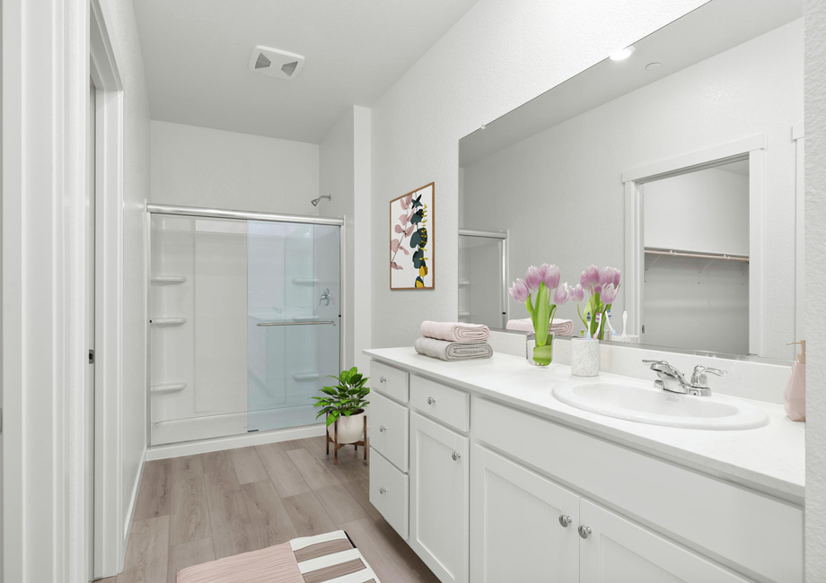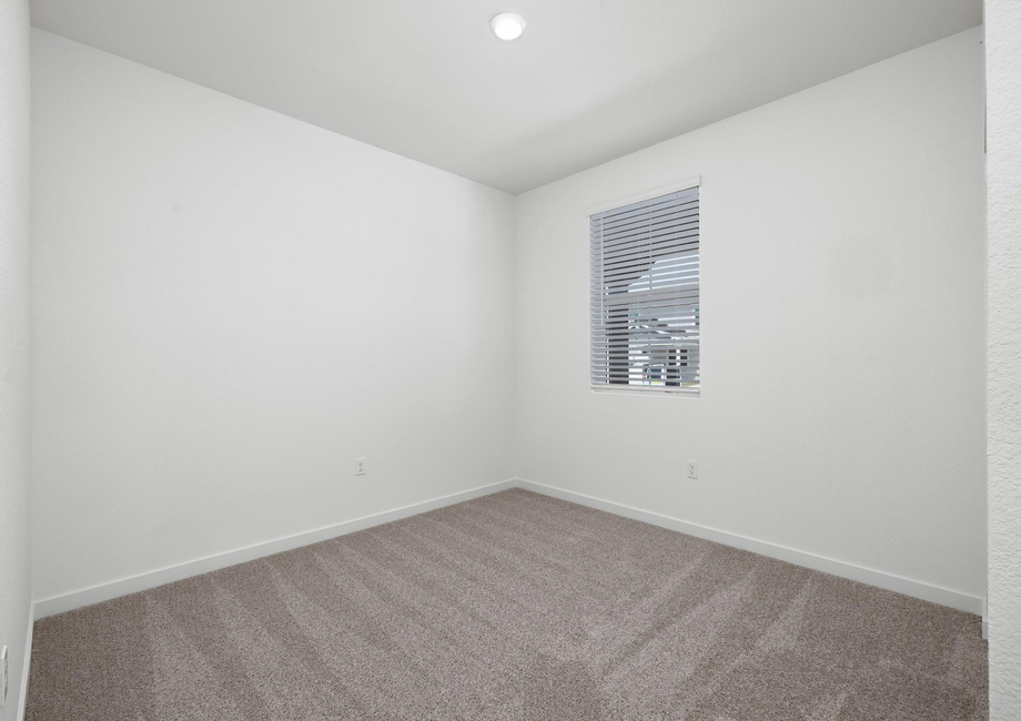Tucked away from the remaining two bedrooms is the roomy master retreat of the Carson plan. In this sprawling suite, enjoy peaceful backyard views and plenty of natural light. This suite also features a private master bath that has a stunning vanity with incredible countertop space, an oversized shower and a walk-in closet.