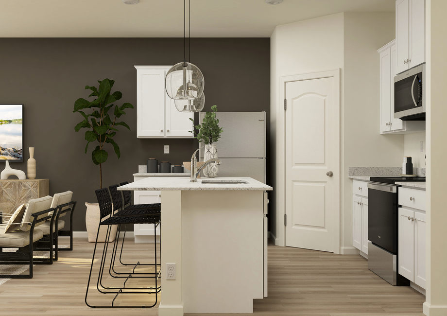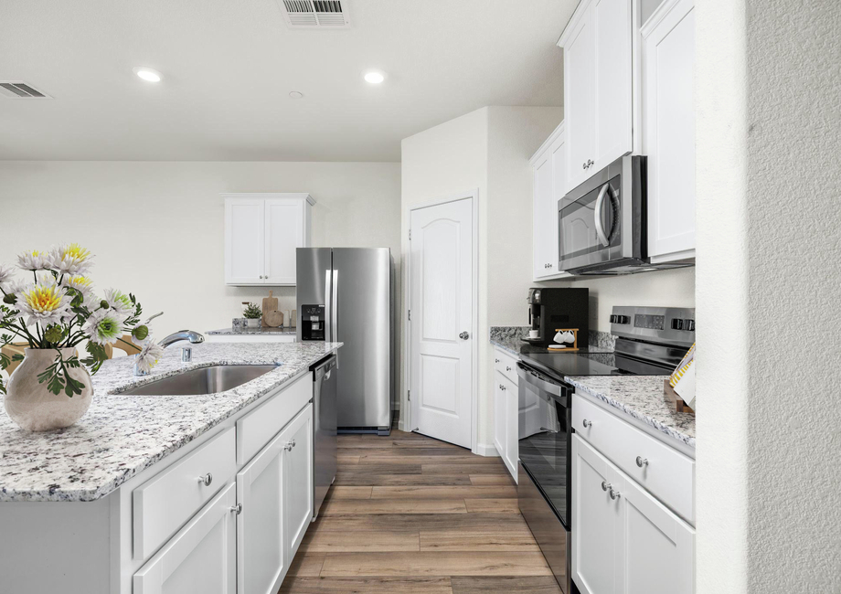 You spend a lot of time in the kitchen, so it should be a room that makes you smile. The open and bright kitchen in the Eureka features granite countertops, gorgeous wood cabinets topped with crown molding, and energy-efficient Whirlpool® appliances. The sprawling granite breakfast bar seats barstools comfortably, providing the perfect perch for preparing, serving and eating. LED flush-mount ENERGY STAR lights and windows in both the kitchen and adjacent dining room ensure your meals will be seen in a positive light.Incredible Upgrades Included