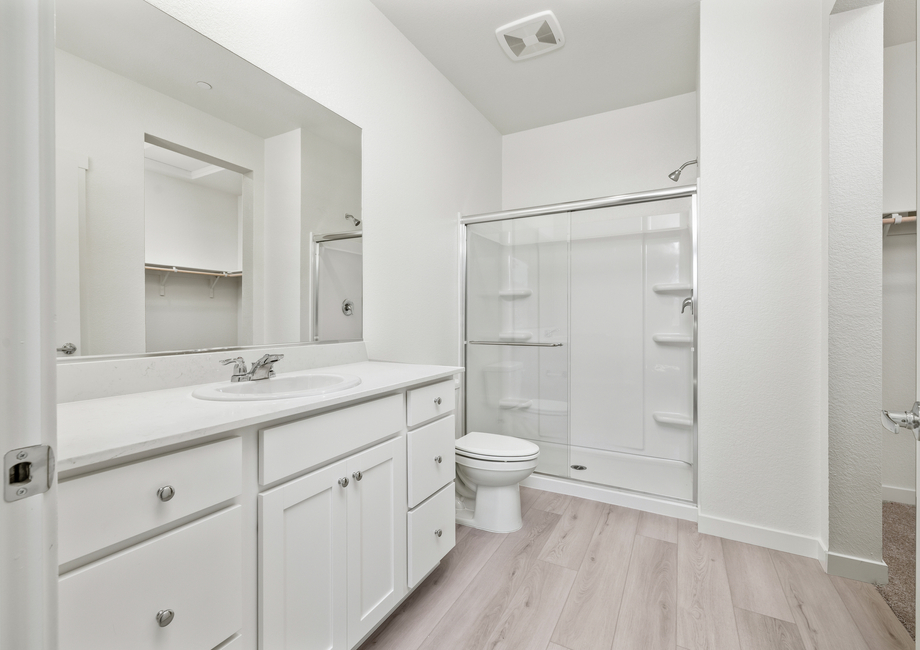 The master suite is a major highlight of the Baker plan. Inside this spacious retreat, enjoy peaceful views and plenty of space for your king-sized furniture and side tables. The master bath showcases a beautiful vanity, a spacious glass-enclosed shower and a huge walk-in closet.