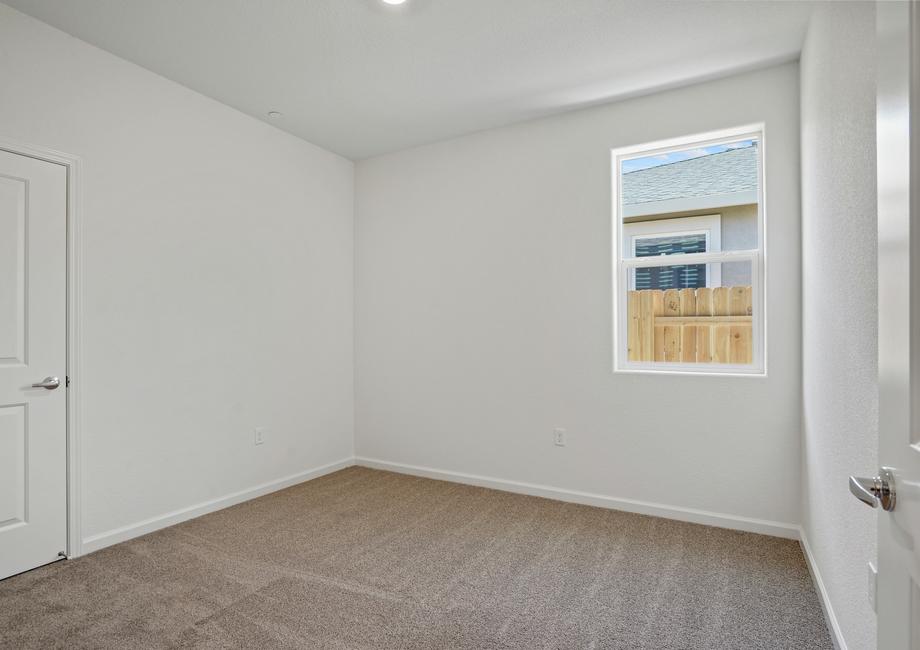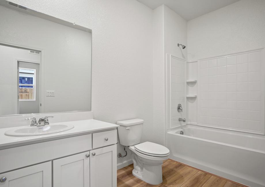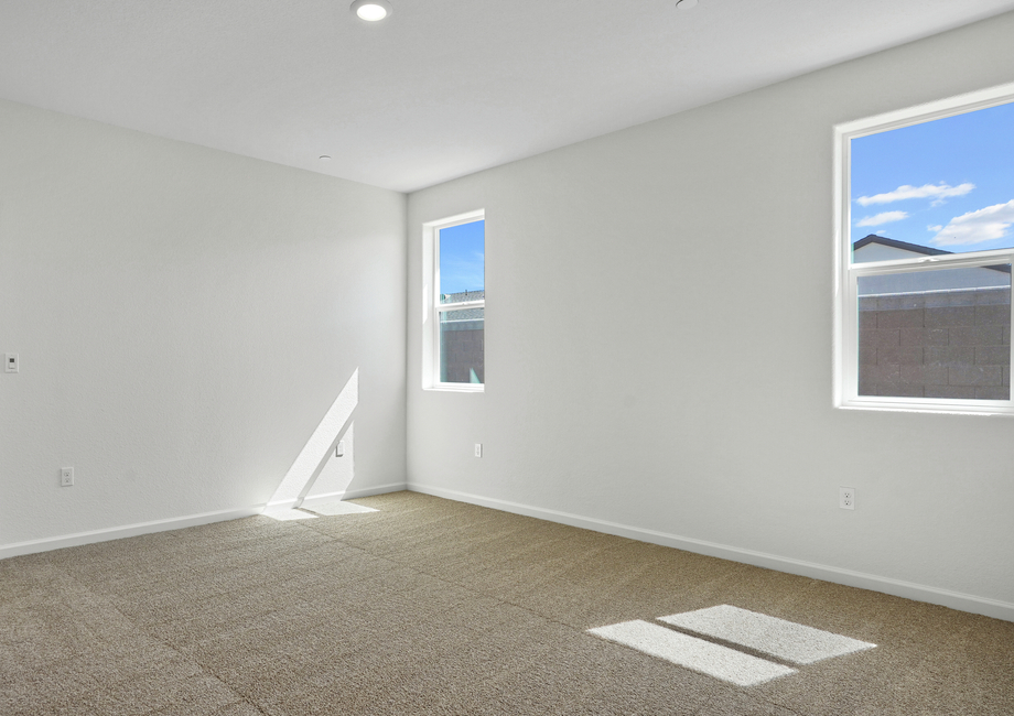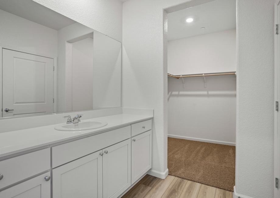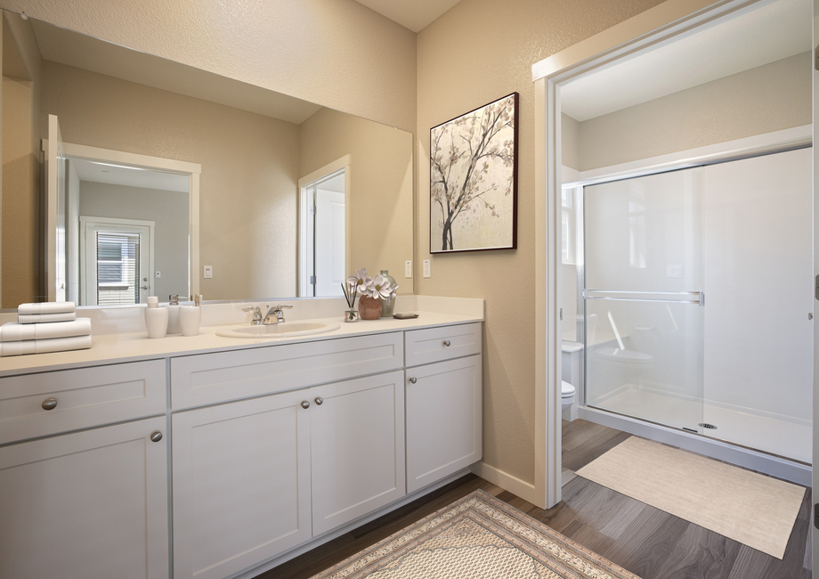 The large master bedroom of the Cooley floor plan in Summit at Liberty is sure to fit your king-sized furniture. The attached bath includes a large vanity and a walk-in shower with a seat. Last but not least, this bedroom has two walk-in closets so you will have plenty of storage for your clothes.