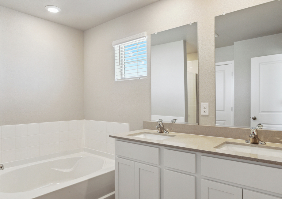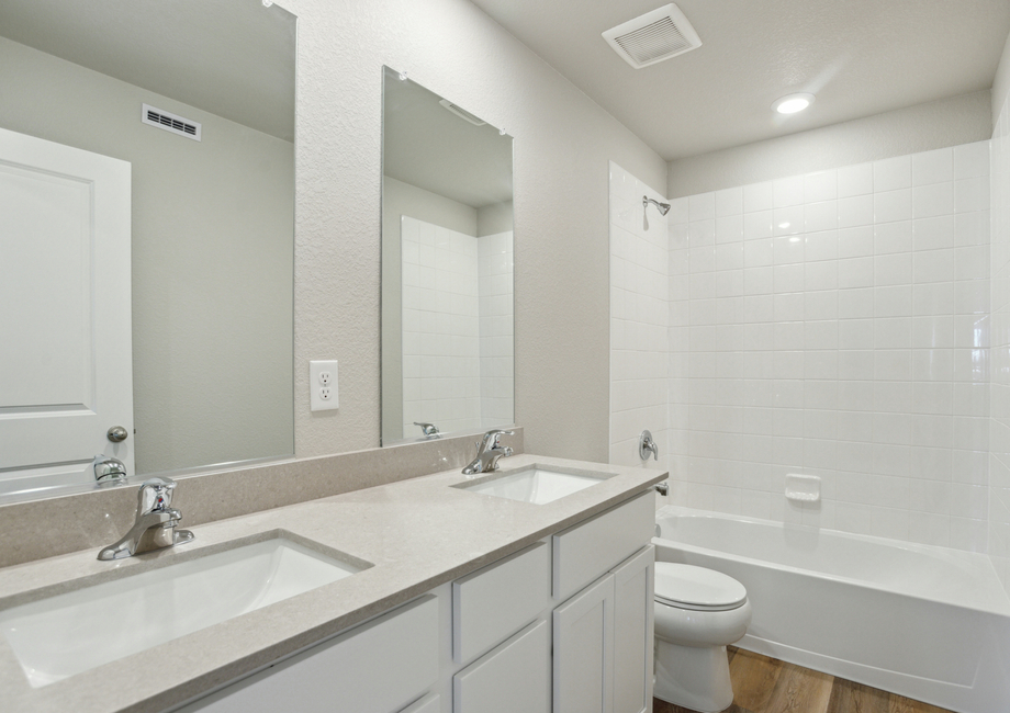 The kitchen in the Platte is the perfect place to gather as a family or host guests. The designer wood cabinets give homeowners plenty of storage for dishes and cookware, while the sprawling quartz countertops provide lots of space for cooking, baking and serving. Whether you are whipping up a weeknight dinner for the family or cooking a Thanksgiving feast for the neighborhood, this kitchen is ready for it! When it is time to clean up, the pull down Moen® faucet and energy-efficient Whirlpool® dishwasher are there to make it a breeze.