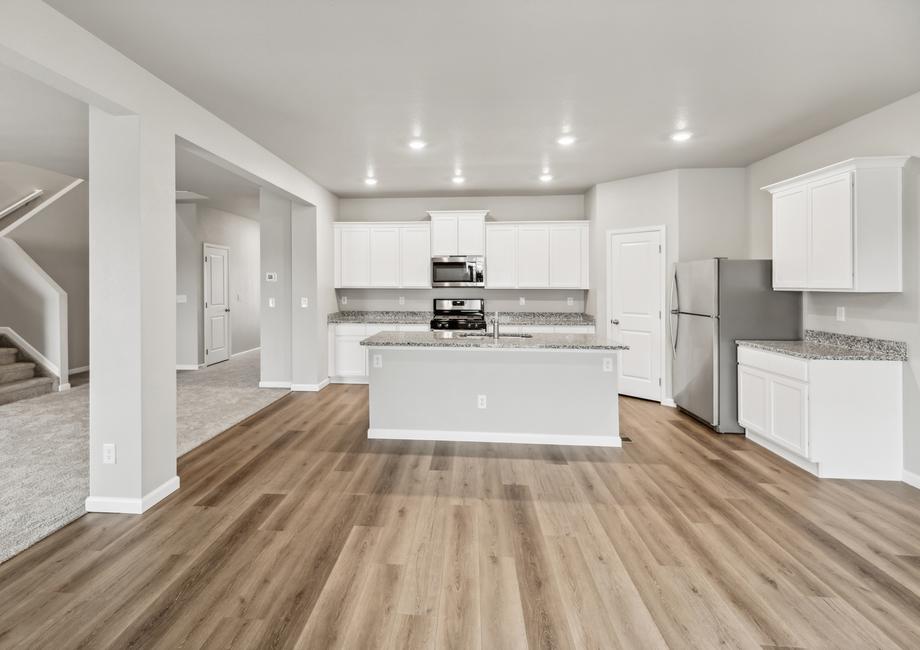 The open layout of the kitchen is designed with functionality in mind and features an abundance of storage space while creating the perfect place to gather as a family or host guests. The focal point of the Harvard kitchen is the stunning granite island and sleek suits of stainless-steel appliances. The look and feel of the kitchen space is enhanced even further by 36” upper cabinets with crown molding, the undermount kitchen sink that includes a Moen® faucet with Power Clean™ spray technology and the beautiful, recessed lighting. The USB-capable kitchen outlet is a convenient and hi-tech addition, while the 9’ ceilings and two-toned interior paint add style to the home!