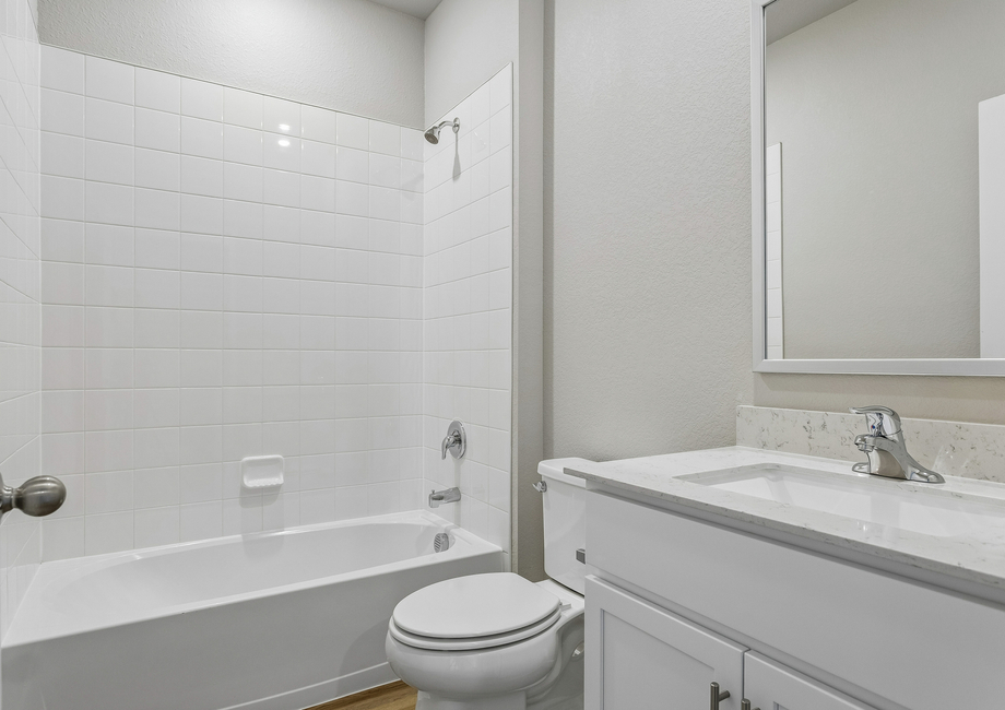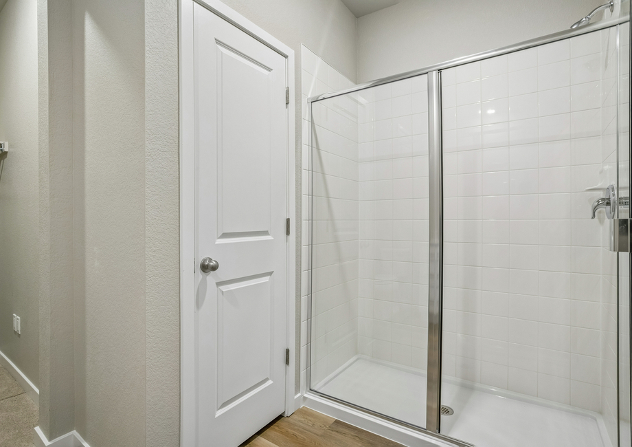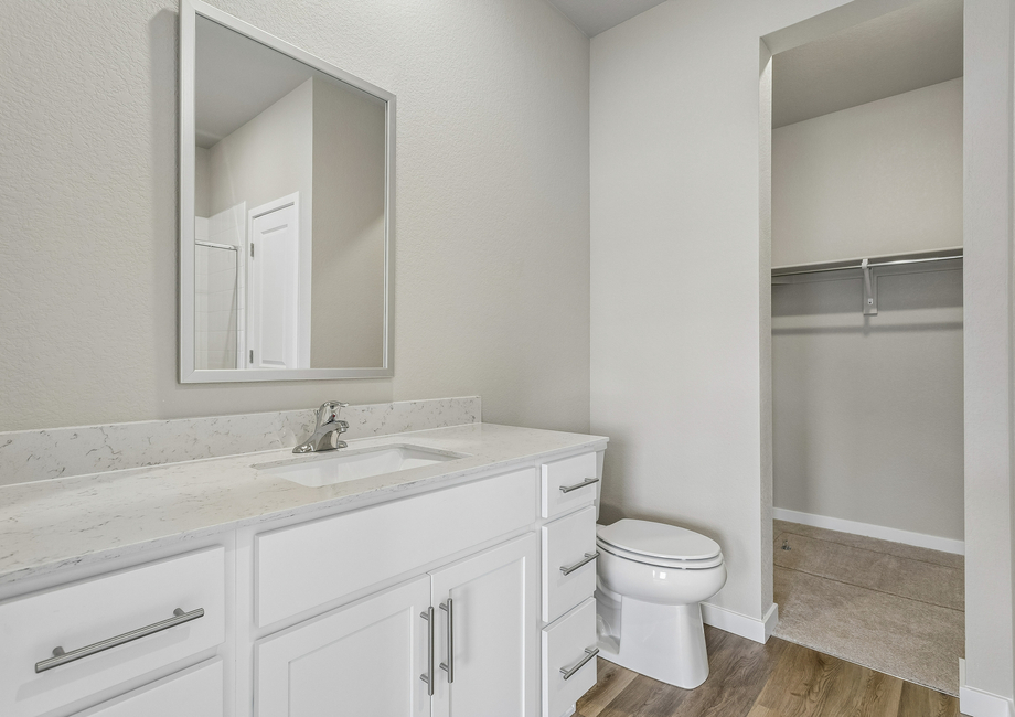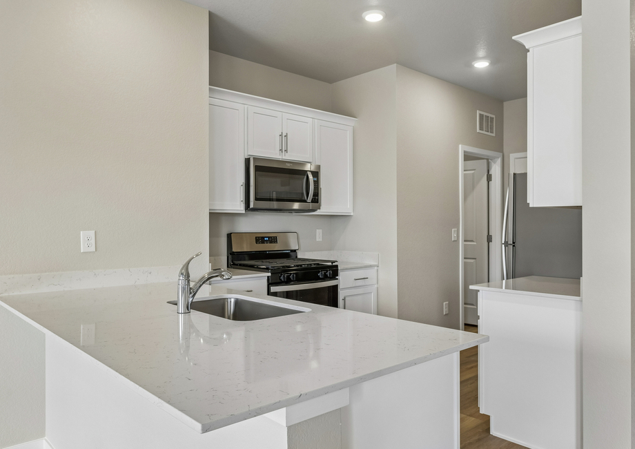 The Durango plan features the perfect kitchen for culinary enthusiasts and entertainers alike. The open layout provides ample space to move and gather while cooking, while the sprawling granite countertops make meal prep and serving a breeze. Outfitted with a full suite of stainless-steel Whirlpool® appliances, including a refrigerator and oven, this kitchen also includes oversized wood cabinetry and recessed LED lighting, creating a bright and functional space.