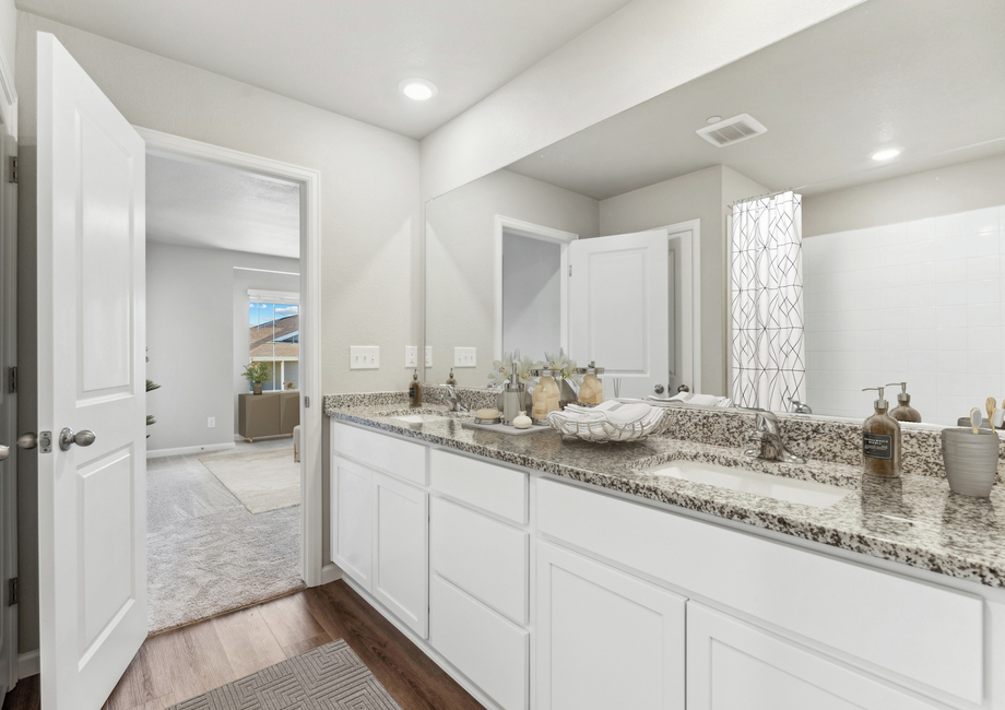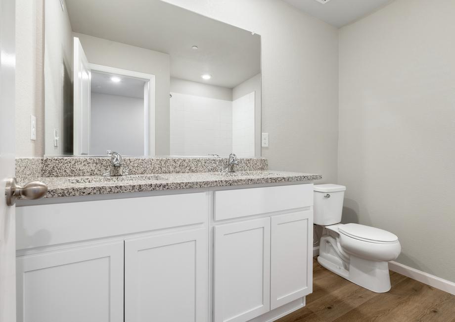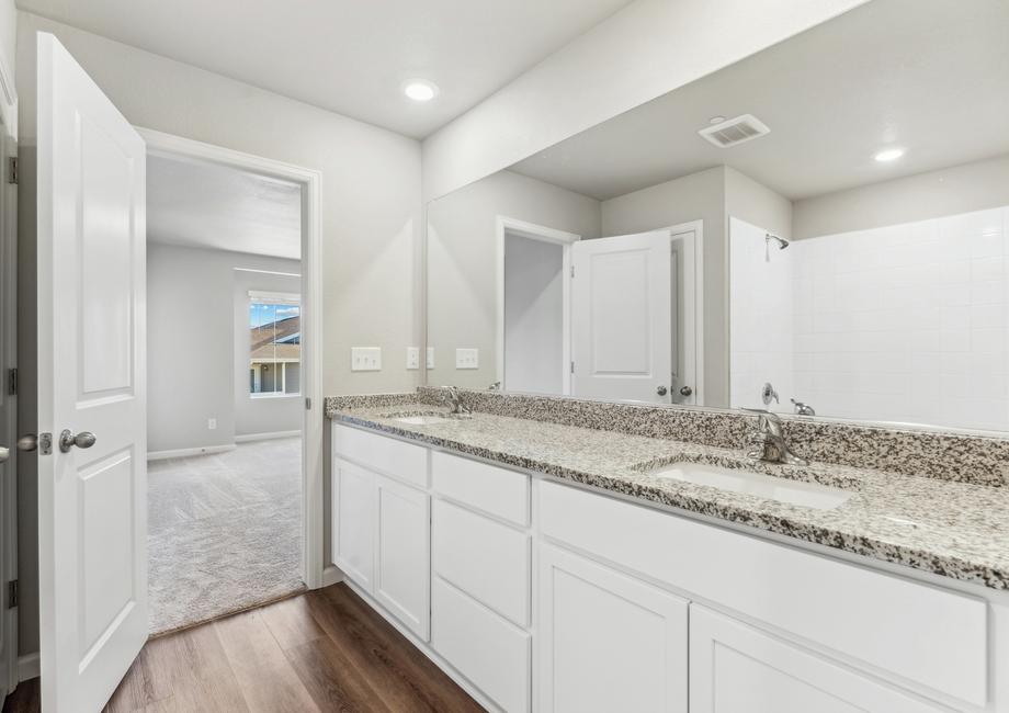 Tucked away upstairs in the Loveland plan is the stunning master suite. Featuring great natural light, peaceful views into the front yard and a private bathroom, this room is perfect for unwinding after a long day. Enjoy the spa-like master bathroom that showcases a double sink vanity and a huge walk-in closet.