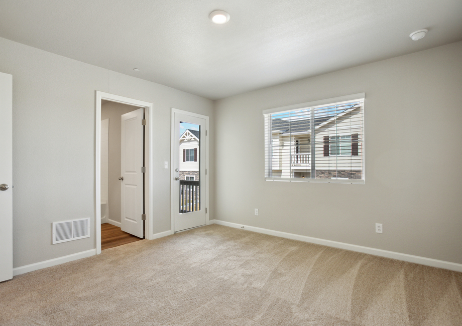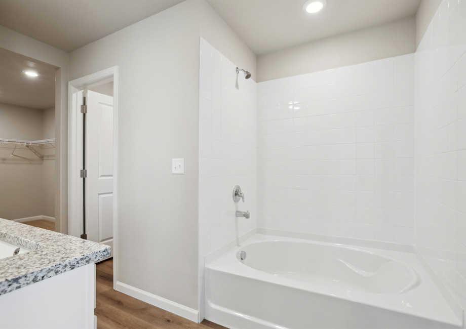 Tucked away from the other two bedrooms, the master suite of the Vail plan has the privacy and space you need. The large room provides homeowners with the needed space for all the king-sized furniture. Enjoy plenty of natural light from the large window, and the privacy of an en suite bathroom. The master bathroom showcases a granite countertop, plenty cabinet space, and a roomy walk-in closet.