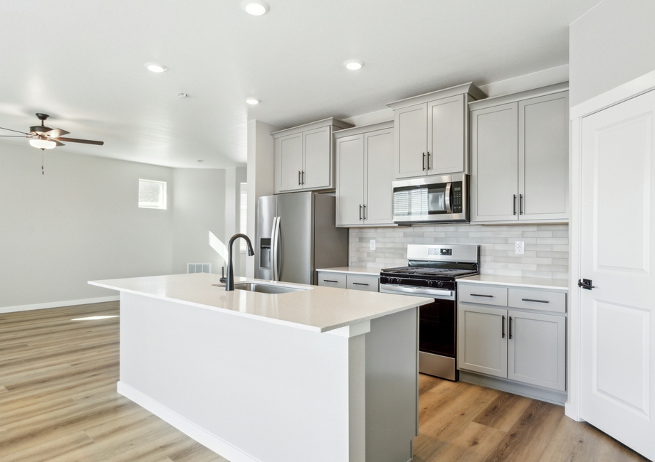 The Ridge's beautiful kitchen is the heart of this remarkable home. Featuring energy-efficient stainless steel appliances and grey cabinets with crown molding, this space combines style and function. The generous walk-in pantry provides ample storage, and the quartz-topped breakfast bar offers additional seating. The dining room, illuminated by natural light, is adjacent to sliding glass doors that lead to your spacious back yard. The open design ensures the family chef stays engaged in every gathering, with the kitchen, dining, and family rooms seamlessly connecting.