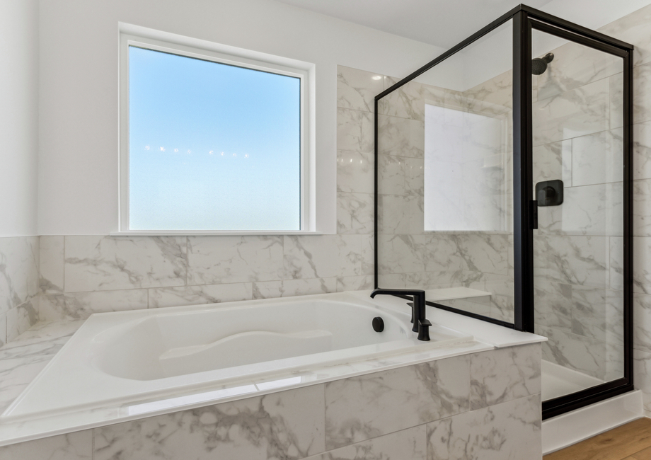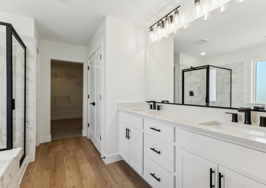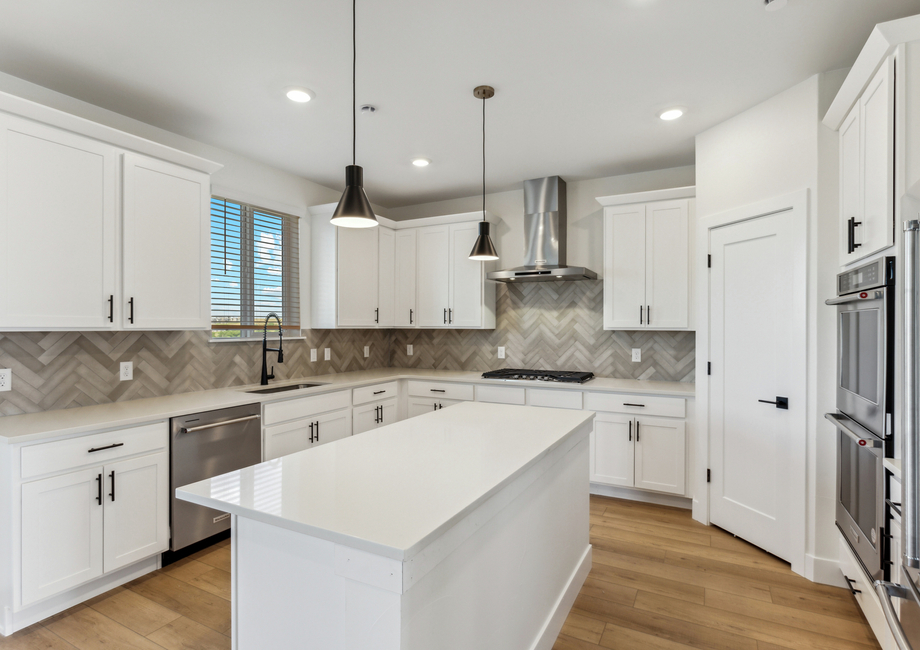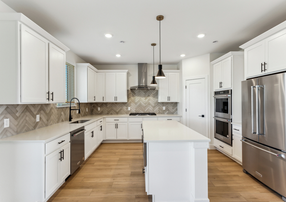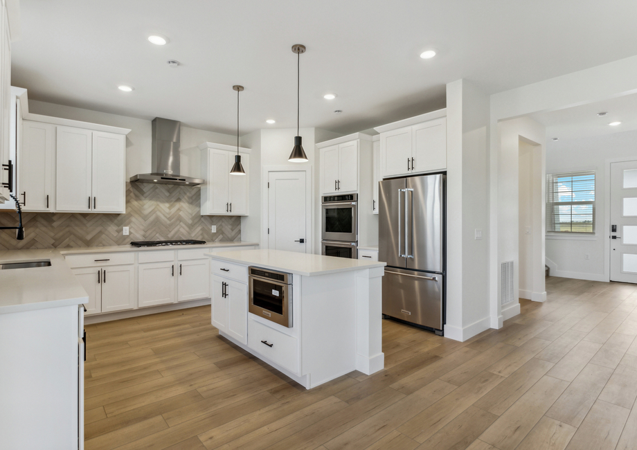 In the Glenwood floor plan, the kitchen stands as a pinnacle of modern functionality and style. With designer white wood cabinetry, expansive quartz countertops and a suite of high-end appliances including a single wall oven, microwave drawer and gas stove top, every detail is crafted for both aesthetics and efficiency. The expansive pantry adds further convenience becoming a space to store food and additional appliances.