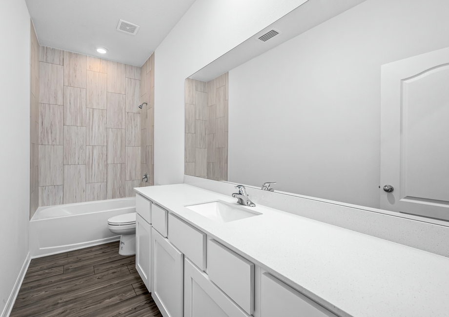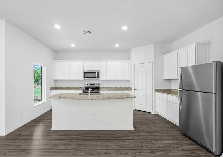 The Coral floor plan offers everything you could want in a home. From the moment you arrive, the professionally landscaped front yard and inviting covered entryway set the stage for what’s inside. With five bedrooms, there’s room for everyone. Whether you need a home office, playroom, or extra guest space, the Coral delivers the flexibility you need. At the heart of the home, the chef-ready kitchen shines with modern upgrades like granite countertops, 36” upper-wood cabinets, and energy-efficient Whirlpool® appliances. A spacious kitchen island provides ample room for meal prep and casual dining, making it a favorite feature among new homeowners.