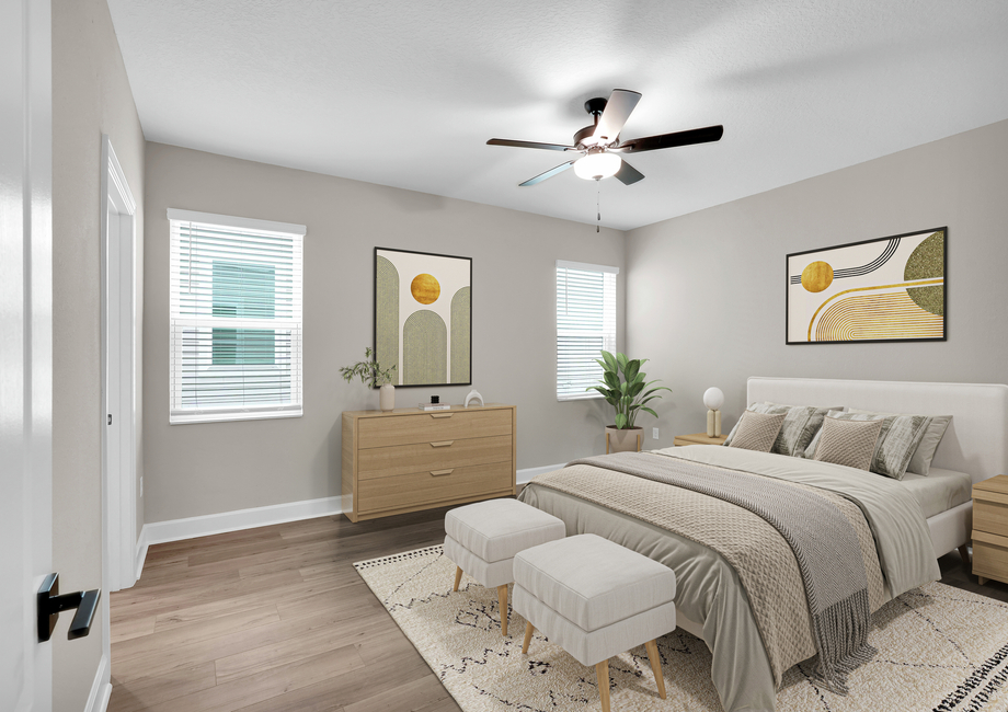 Unwind in style within the master suite, a sanctuary designed for ultimate relaxation after a busy day. This serene retreat is bathed in natural light from its generous windows and boasts a luxurious bathroom featuring a double-sink vanity and a walk-in shower, providing a perfect escape for rejuvenation and comfort.