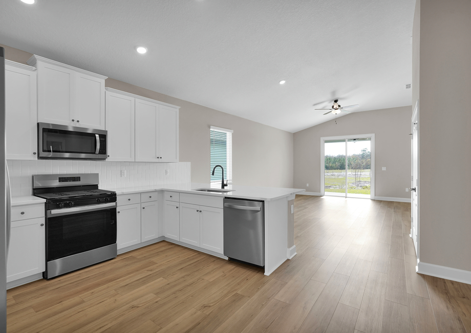 Experience elevated living with the CompleteHomePlus™ package, which includes premium upgrades at no additional cost. Revel in the grandeur of soaring ceilings and the full suite of brand-new Whirlpool® appliances, including the refrigerator, built-in dishwasher, stove, and microwave. The Hillcrest kitchen is further enhanced with 36" upper wood cabinets with crown molding, convenient USB outlets, and sleek LED flush mount ENERGY STAR lighting, all adding a touch of sophistication and functionality.