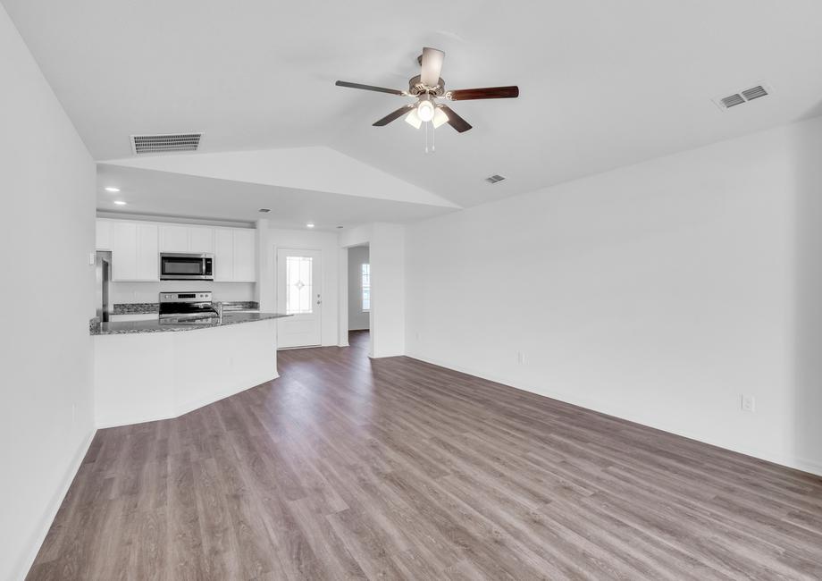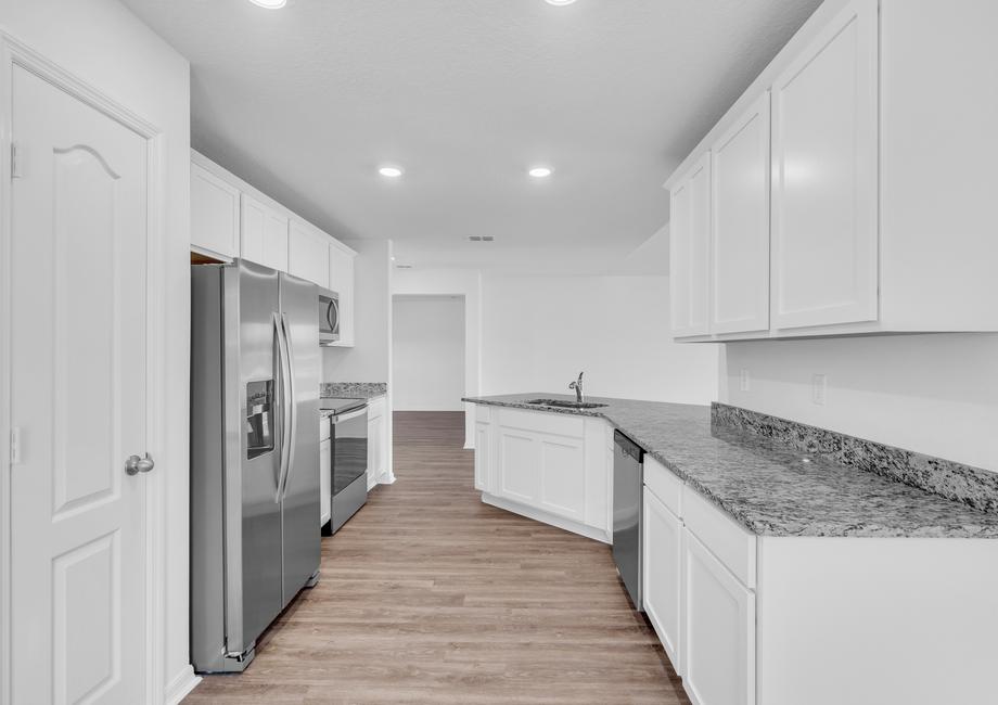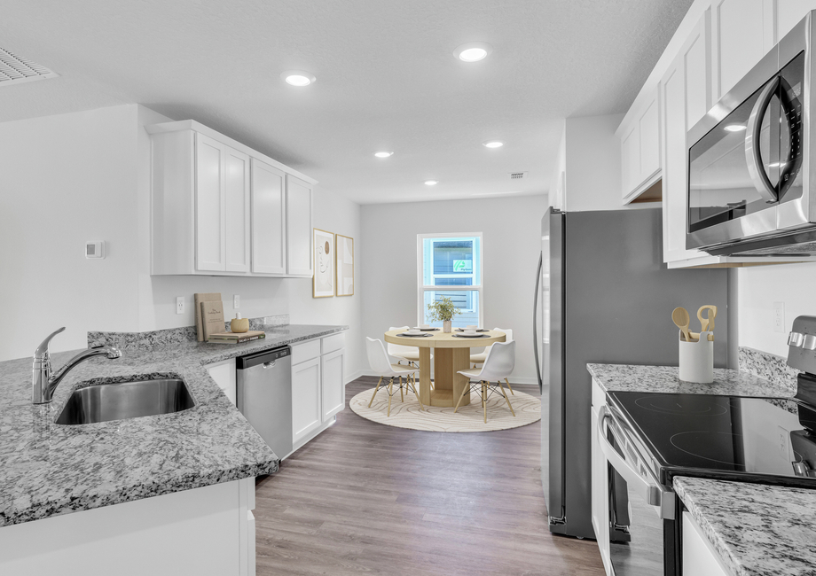 The heart of the Sunnyside is its kitchen, where modern Whirlpool® appliances, tall kitchen cabinets, and ample counter space come together to make meal preparation a breeze. The kitchen bar also serves as a versatile spot for casual meals or a delightful place to entertain friends. Additionally, a breakfast nook is included in this kitchen, perfect for a small table for meals on the go. Adjacent to the kitchen is a dedicated dining room, providing the perfect setting for family meals and special occasions. Whether you're hosting a dinner party or simply enjoying a family breakfast, the convenience of the dining room enhances the overall appeal of the home.