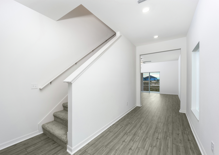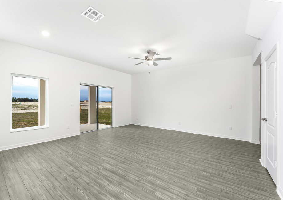 The Mangrove offers the ideal downstairs layout for family gatherings, where every detail is designed to enhance togetherness. The kitchen features exceptional counter space and a sprawling island that includes a convenient breakfast bar. In the kitchen, a generously sized four-shelf pantry ensures there's ample room to keep everything organized. The family room and dining area effortlessly flow into each other and the kitchen, creating a cohesive space perfect for entertaining or relaxing together. A sliding door in the family room opens to the back lanai, seamlessly extending the living area outdoors for a harmonious blend of indoor and outdoor enjoyment.
