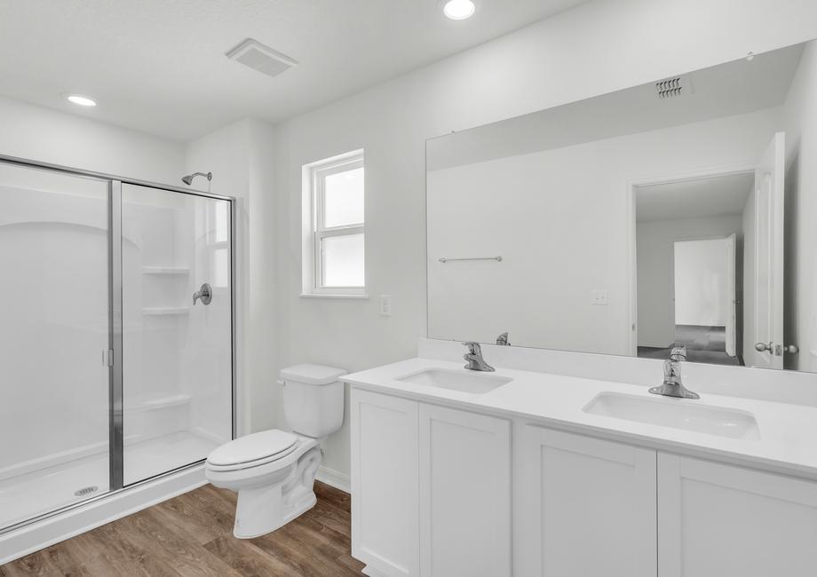 The master suite is the perfect place to relax after a long day at work. The master suite comes equipped with windows that let in plenty of bright, natural light as well as a stunning bathroom that includes a double sink counter and walk-in shower.