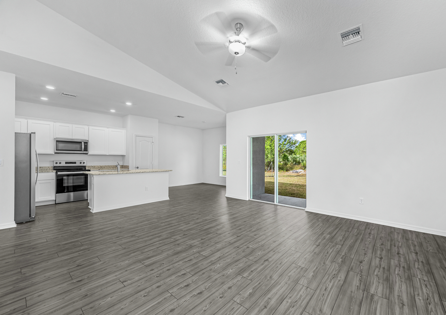 The open kitchen in the Braden floor plan includes stunning granite countertops, beautiful wood cabinets with crown molding, and energy-efficient appliances. The spacious granite island comfortably accommodates barstools, making it ideal for meal prep, serving, and dining. With LED flush-mount ENERGY STAR lights and a beautiful large window in the adjoining dining room, every meal will shine in the best possible light.
