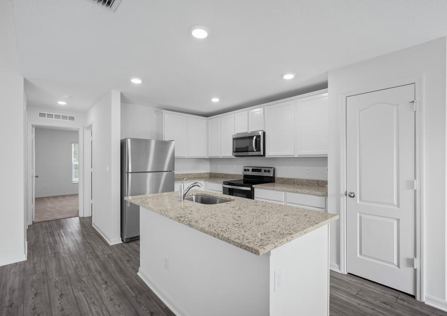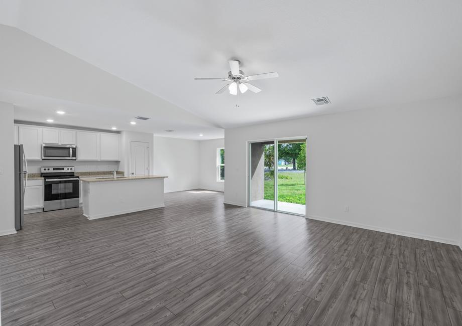 Hosting in the Brickell plan is made easy with the incredible open-concept layout. In the heart of the home, the Brickell kitchen features all new energy-efficient Whirlpool® appliances. Residents can expect to save on purchasing a new refrigerator, microwave and a stove as these are already included! Want even more to love about the kitchen? The sprawling granite countertops and breakfast bar are a fan favorite that new homeowners are raving about. Looking to impress at your next get-together? The entertainment space stretches from the dining to family room, providing the perfect backdrop for any celebration. Even better, take the party outdoors on the covered back patio for a change of scenery on a gorgeous day.