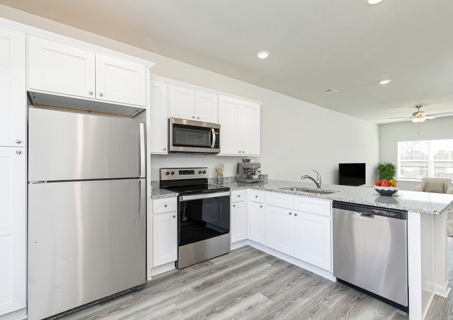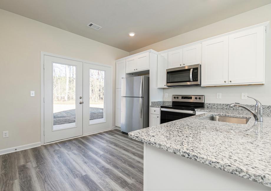 The kitchen of the Dogwood plan is perfect for preparing your family’s favorite meals and treats. Enjoy great cabinet space, energy-efficient appliances and vinyl plank flooring. In addition, this kitchen features the extra added prep space of a sprawling granite kitchen countertops!