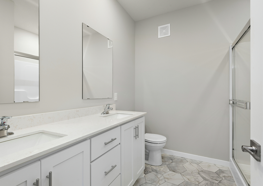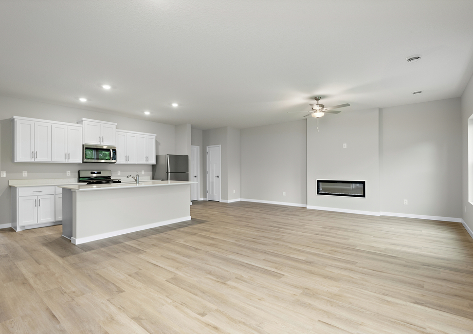 The Harris plan features the perfect kitchen for culinary enthusiasts and entertainers alike. The open layout provides ample space to move and gather while cooking, while the sprawling quartz countertops make meal prep and serving a breeze. Outfitted with a full suite of stainless-steel Whirlpool® appliances, including a refrigerator and oven, this kitchen also includes oversized wood cabinetry and recessed LED lighting, creating a bright and functional space.