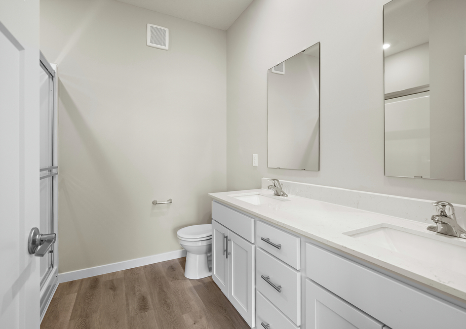 The master suite in the Hancock plan at Triplett Farms offers a spacious bedroom with a huge walk-in closet and two large windows that fill the space with natural light. In the impressive attached bathroom, a dual-sink vanity illuminated by decorator light fixtures and a step-in shower create the perfect space to unwind and pamper yourself after a long day.