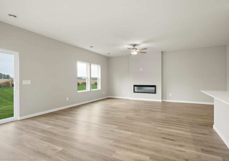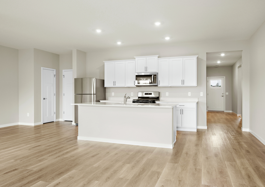 The upgraded and spacious Hancock floor plan by LGI Homes is available now at Triplett Farms, the community of move-in ready homes for sale now. This gorgeous home offers three bedrooms, two bathrooms, and generously sized entertainment areas designed to meet the needs of modern families. Homeowners will appreciate the well-equipped kitchen of the Hancock, which opens seamlessly to the family and dining rooms. A sprawling breakfast bar, perfect for barstools, sets the stage for morning coffee, quick meals, or catching up on the day’s events. A full suite of energy-efficient Whirlpool® appliances, including a refrigerator and built-in microwave is included with this home. A walk-in pantry, brushed chrome Moen faucet, and extra-deep undermounted sink add both style and convenience.