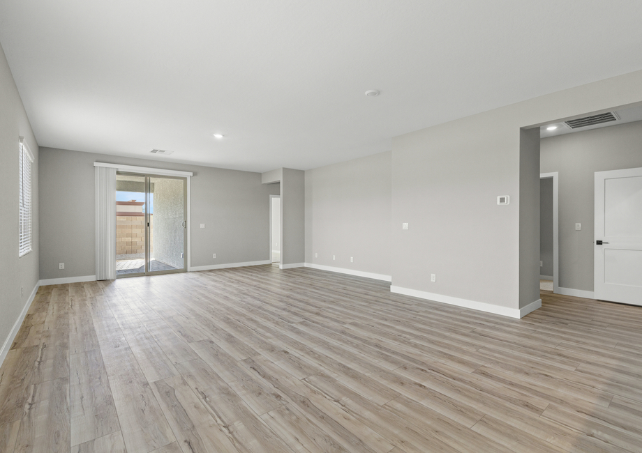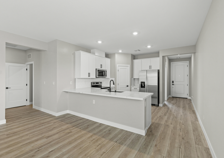 The Ruby floor plan features a spacious living area, kitchen and dining room that are seamlessly connected, creating a perfect open-concept space for both relaxation and entertaining. The large living area offers plenty of room for family gatherings, while the kitchen provides ample counter space and upgraded, modern appliances making cooking and meal prep a breeze. The dining room flows directly into both the living area and kitchen, creating a natural gathering spot for meals and socializing. This layout brings comfort and convenience together.