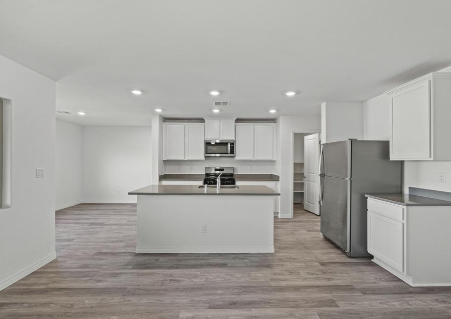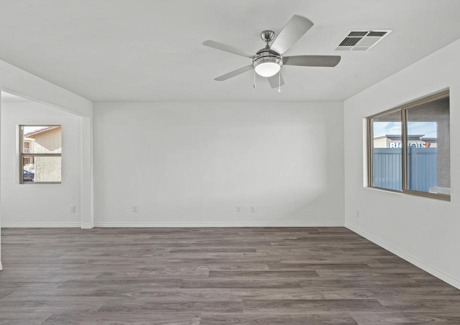 The spectacular space offers picturesque views of the covered back patio and the fully equipped kitchen. Showcasing Whirlpool® appliances and an oversized quartz island, you can look forward to creating delicious meals in the heart of the home. With so much room to create lasting memories, this well-designed, open floor plan is made for entertaining.