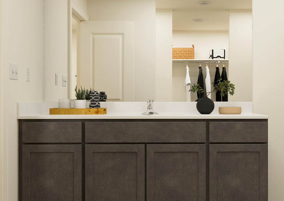 The Abbott floor plan at Vistas at Los Senderos is a spacious one-story home featuring an open-concept layout. The family and dining room seamlessly connect to the kitchen making everyday activities easy. The home boasts two bedrooms and bathrooms including a stunning private master suite with a en-suite bathroom. The covered front porch gives great curb appeal to welcome you and guests home.