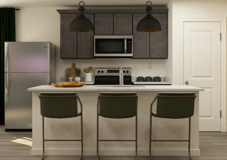 The kitchen of the Abbott floor plan is a homeowners dream! Complete with beautiful quartz countertops, wood cabinetry with crown molding, this kitchen is the centerpiece of the home. There is plenty of storage place for all your favorite foods and a full suite of Whirlpool® kitchen appliances that will make cooking meals easy and enjoyable.