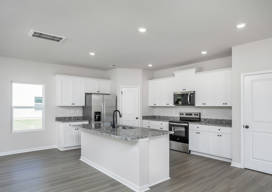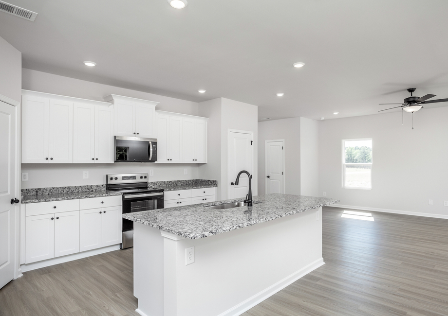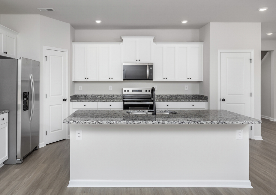 At the center of the Camden is the chef-ready kitchen, fully loaded with upgraded features that elevate everyday cooking. Enjoy granite countertops, 36” upper cabinets with crown molding, stainless steel appliances, and a large center island perfect for prepping meals, serving guests, or helping the kids with homework. The open design flows effortlessly into the dining area and family room, keeping you connected to everyone while you cook.