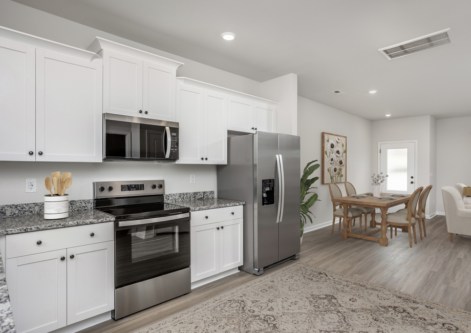 The first floor of the Drew was made for connection. The open-concept layout seamlessly combines the kitchen, dining, and living areas, creating a welcoming space perfect for entertaining or spending time with family. The chef-ready kitchen features sleek countertops, ample cabinetry, and modern appliances that make meal prep effortless. The adjoining dining area provides a bright, inviting setting for meals and gatherings, while the living room offers a comfortable place to relax and unwind. A half-bathroom on the main level adds everyday convenience for residents and guests alike.