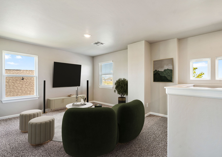 The upstairs game room loft in the Murray floor plan offers a versatile and inviting space perfect for a range of uses. This flexible area can be easily transformed into a playroom, a home office or a cozy lounge, depending on your family's needs and preferences. Its location away from the main living areas provides a sense of separation and privacy, making it an ideal spot for relaxation or entertainment. The game room loft enhances the home’s functionality, providing the space that your family desires.