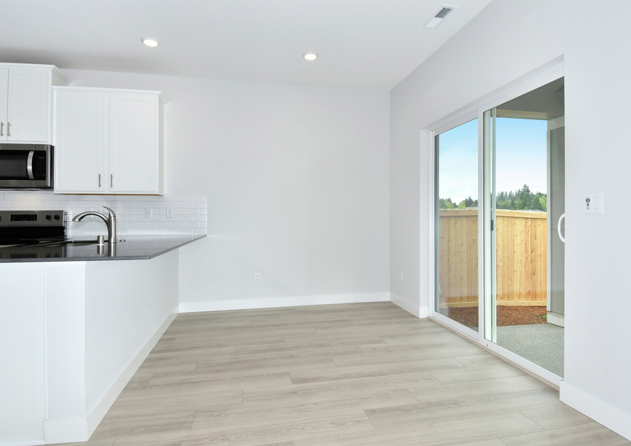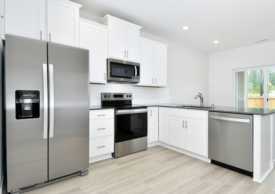 The Baker features a huge open concept living area on the first floor. Modern flooring adds style to this home, where there’s plenty of space for your living room sofa, entertainment center and coffee table. Also attached to the living area is a large dining room. You can also enjoy time outdoors on your covered porch accessible from the dining room.