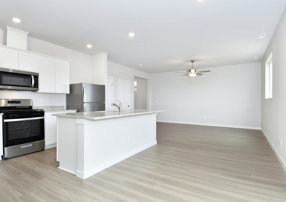 The open-concept entertaining areas of the Hawthorn provide the perfect backdrop for your gatherings, big and small. The spacious living room easily accommodates a sectional sofa and entertainment center and features a large window overlooking the back yard. The open and bright kitchen is equipped with granite countertops, gorgeous wood cabinets topped with crown molding, and stainless-steel Whirlpool® appliances. LED flush mount ENERGY STAR lights and a sliding glass door in the dining room ensure your meals are seen in a positive light.