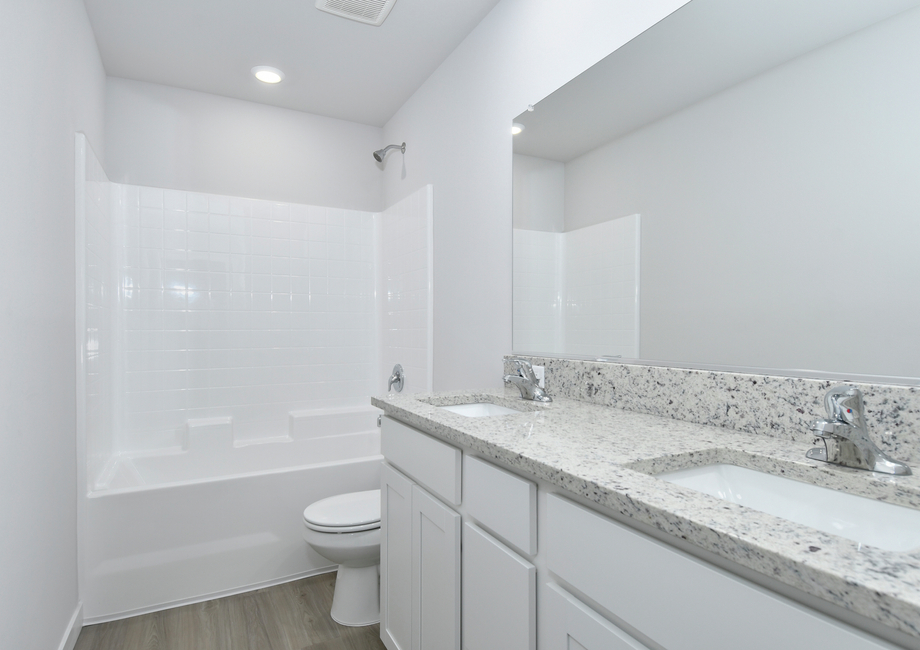 The spacious upstairs master retreat is one of the most coveted features of the Hawthorn plan. This private suite features an incredible amount of space for homeowners to enjoy. The sprawling bedroom can accommodate larger furniture sets and the huge walk-in closet will handle your full wardrobe. Inside the luxurious master bathroom, pamper yourself with a large soaking tub, separate step-in shower, and stunning dual-sink vanity with decorative light fixtures.