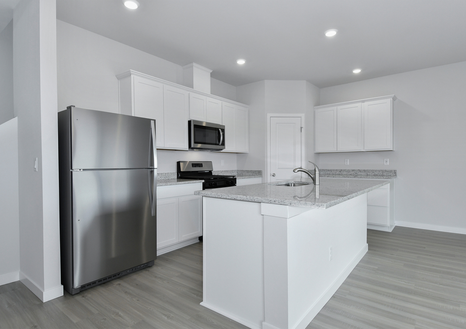 The Larch at Dove Landing features an incredible kitchen designed to ignite culinary creativity. Sprawling granite counters create a beautiful workspace to prepare food and offer plenty of room to display appliances and gadgets. Gorgeous wood cabinets topped with crown molding ensure everything will have a place within reach of the family chef – including larger appliances, serving platters, linens and more! A full suite of Whirlpool® kitchen appliances - including a refrigerator, electric range with easy-wipe ceramic glass cooktop, dishwasher and built-in microwave - add energy-efficiency and style!