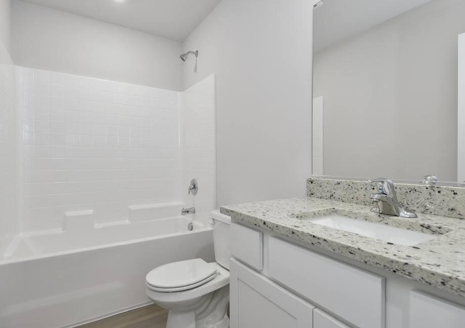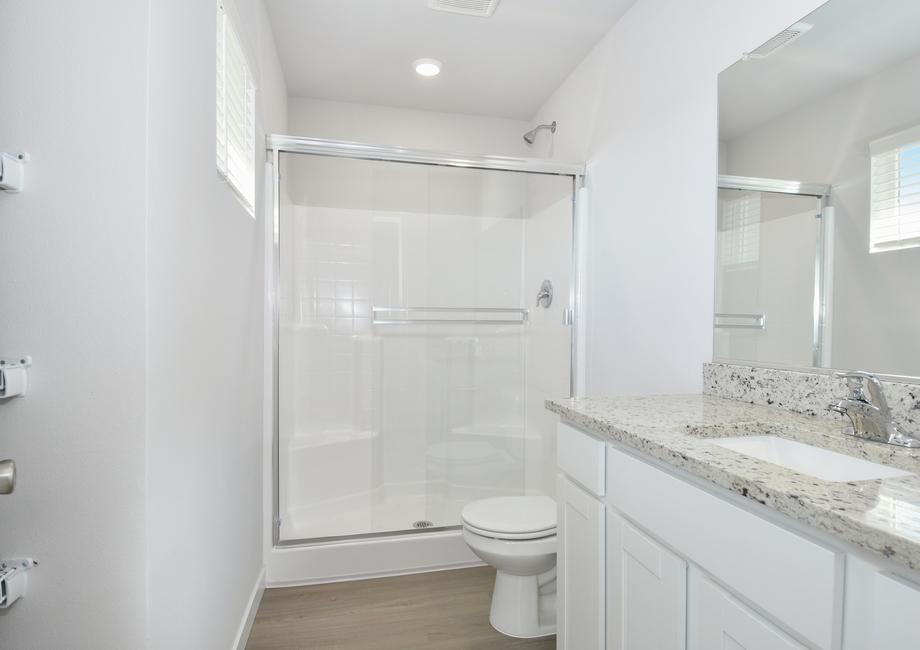 The McKenzie is the perfect choice for homeowners desiring additional space to stretch out while keeping everything organized and tucked-away. With three bedrooms and two-and-a-half bathrooms, this gorgeous home provides luxurious spaces for every family member to rest and recharge each day. A large window in the spacious master bedroom provide views of the front yard. The spacious attached bathroom includes a step-in shower, large vanity and a large walk-in closet.