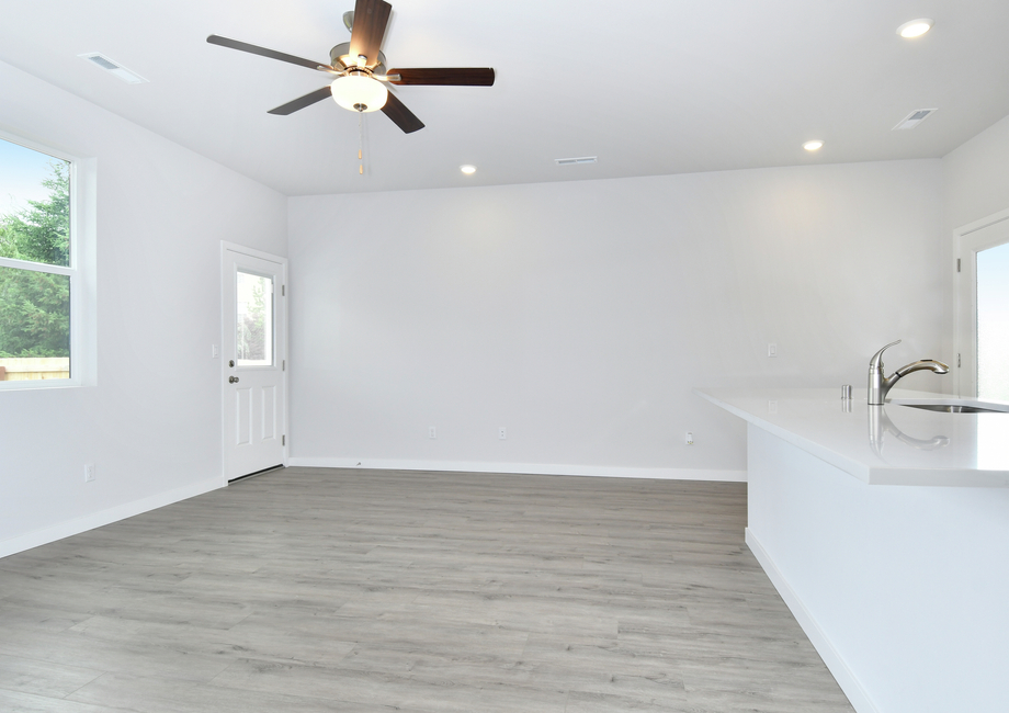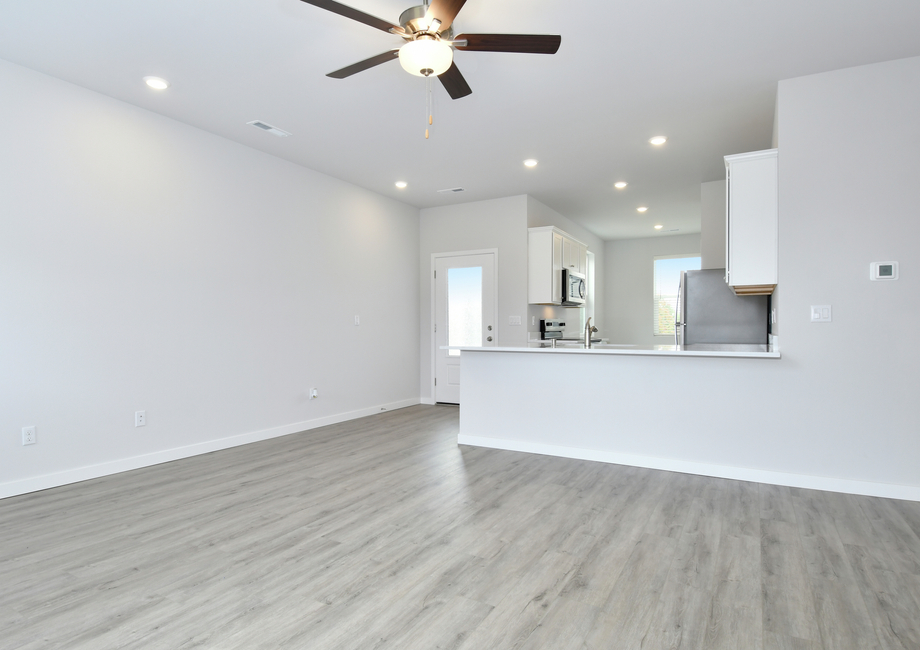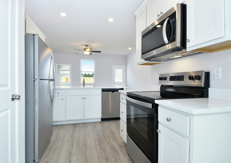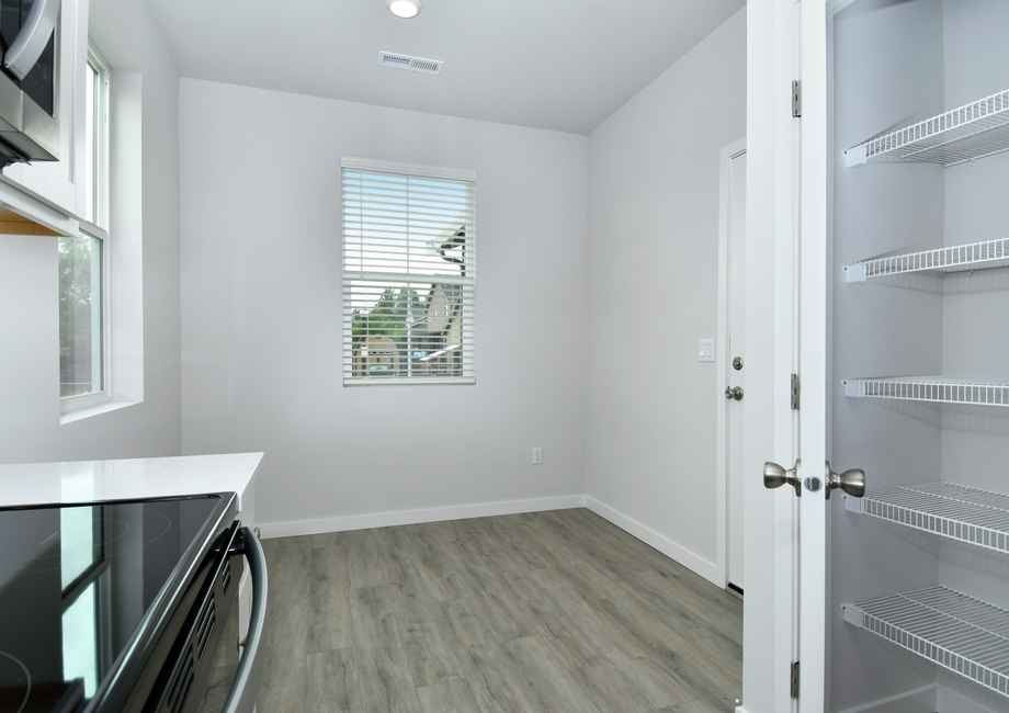 The kitchen of the American plan at Park Meadow is ready for family dinners, gathering friends and creating lasting memories. This room comes completely chef-ready with sprawling granite countertops, energy-efficient appliances, abundant cabinet storage and the flexibility of an island. Recessed LED lighting highlights the gorgeous modern gray cabinetry and the durable plank flooring in this space.