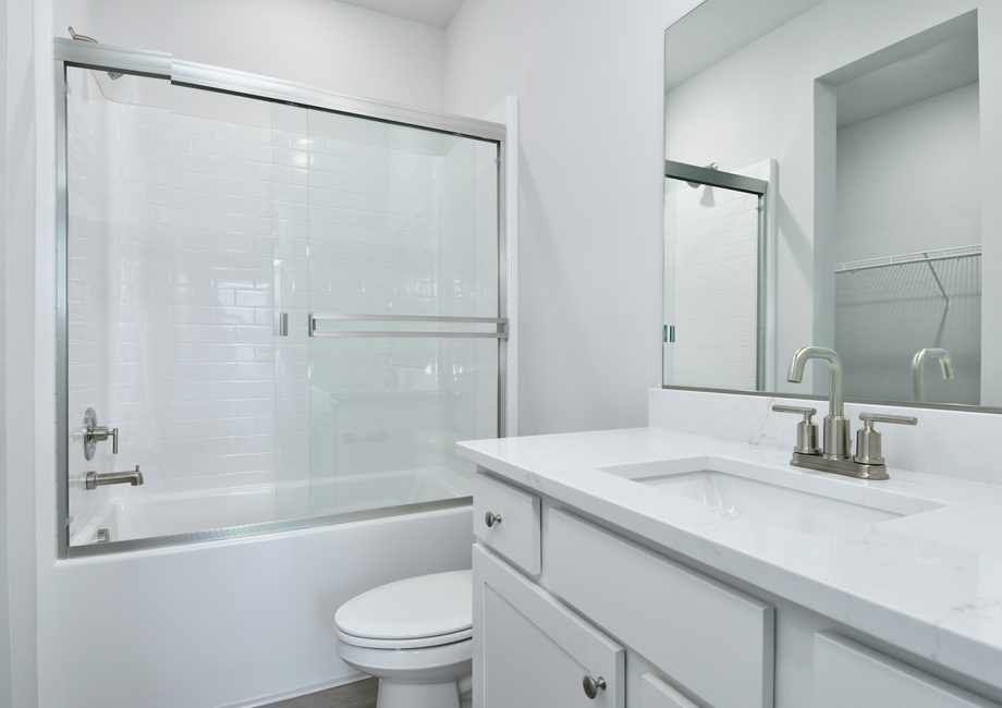 The curb appeal of the American is stunning with a two-tone exterior paint scheme, multiple coach lights and professional front yard landscaping. This home also includes an attached 2-car garage with a Wi-Fi-enabled garage door opener. Enjoy coming home to a beautifully landscaped front yard and a spacious walkway that welcomes you inside.