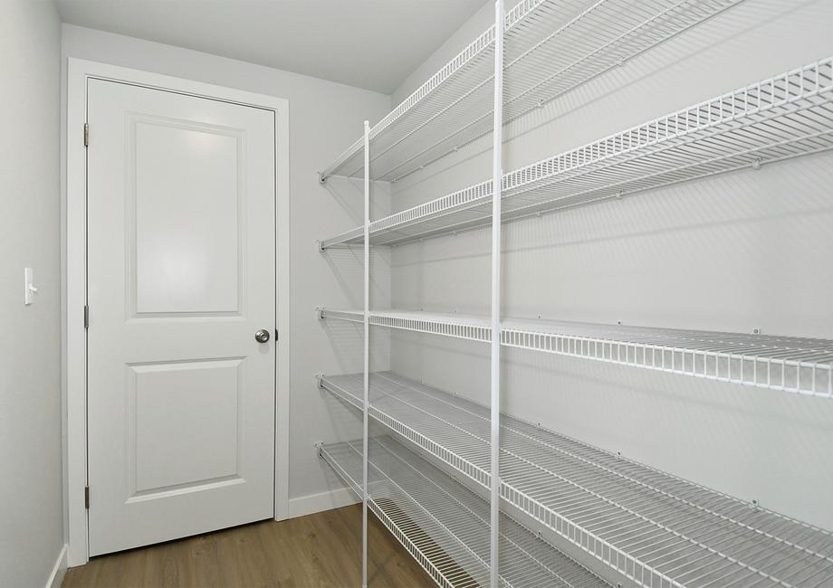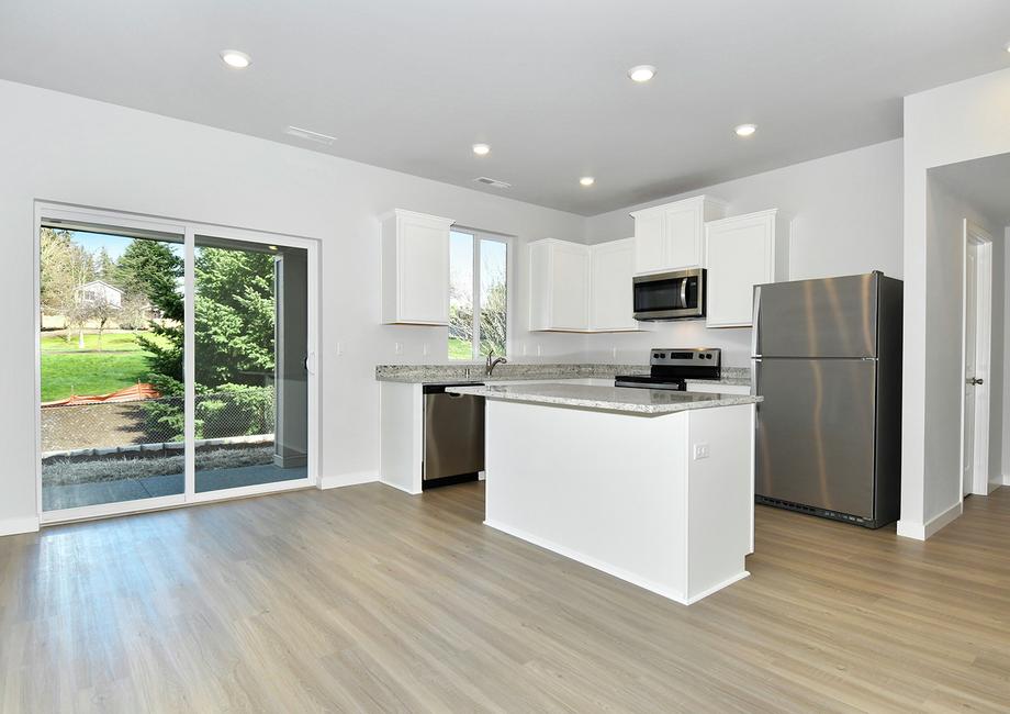 The kitchen of the Henry plan at Walnut Grove is ready for family dinners, gathering friends and creating lasting memories. This room comes completely chef-ready with sprawling quartz countertops, energy-efficient appliances, abundant cabinet storage and the flexibility of an island. Recessed LED lighting highlights the gorgeous modern gray cabinetry and the durable plank flooring in this space