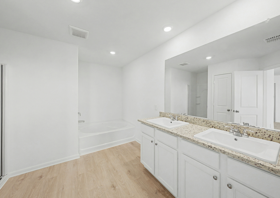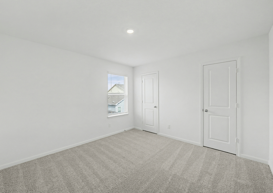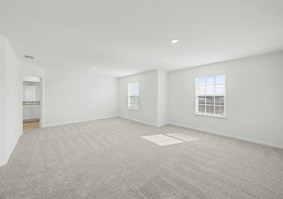 The second floor, private master suite boasts a large bedroom with two windows that allow sunlight to flow through. The two large walk-in closets are conveniently located at the front of the room, while an attached master bathroom features a walk-in shower and soaking tub.