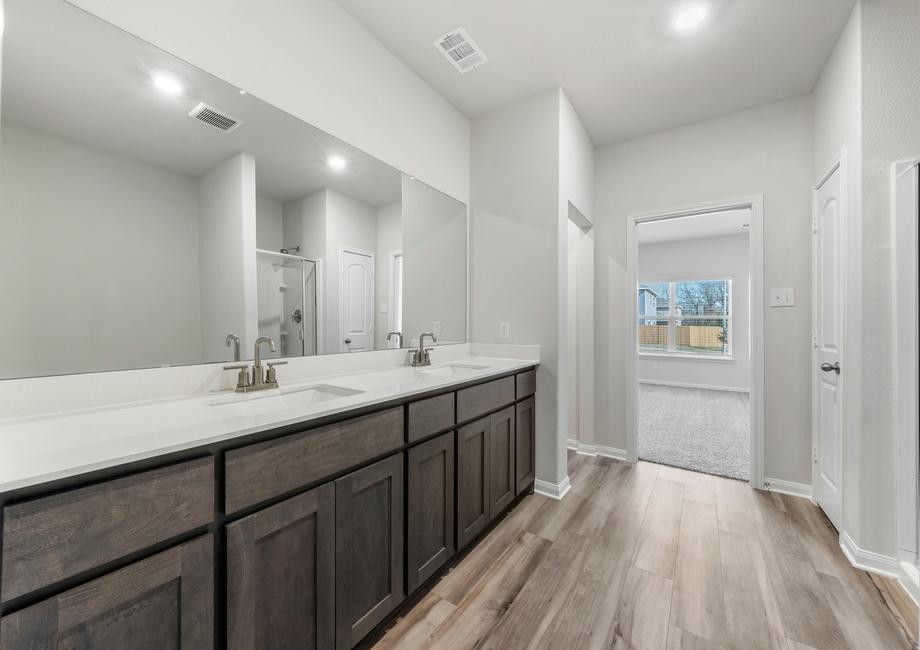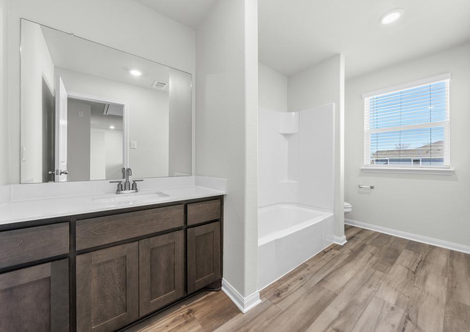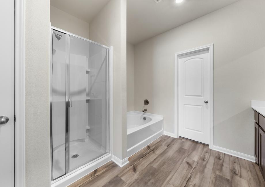 The Cypress plan boasts a spacious, main floor master retreat. Enjoy the peace and privacy you desire in this stunning suite. Inside, you’ll find tranquil front yard views and a spa-like master bath with a large soaker tub, a glass-enclosed shower and a huge walk-in closet.