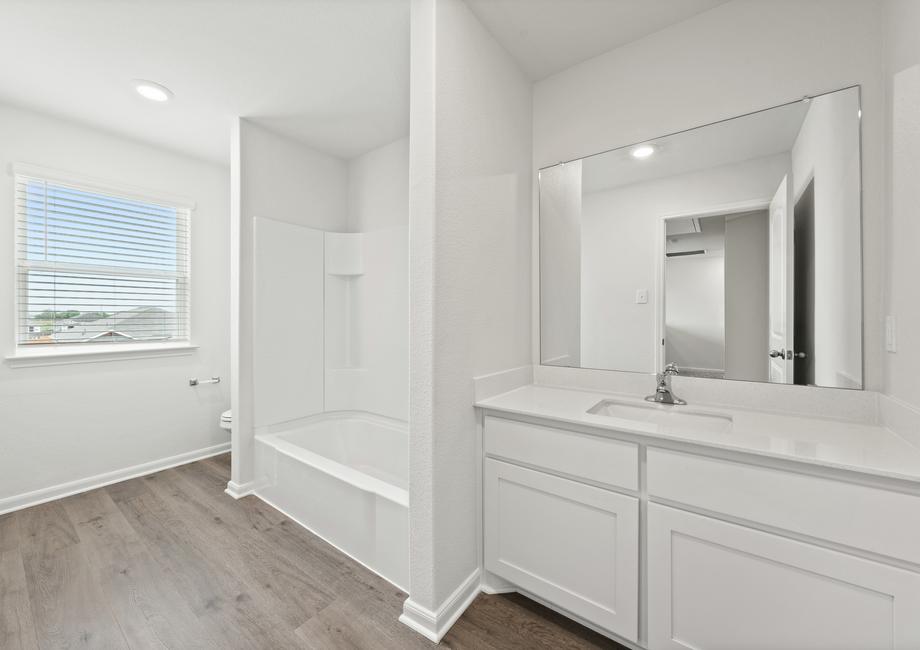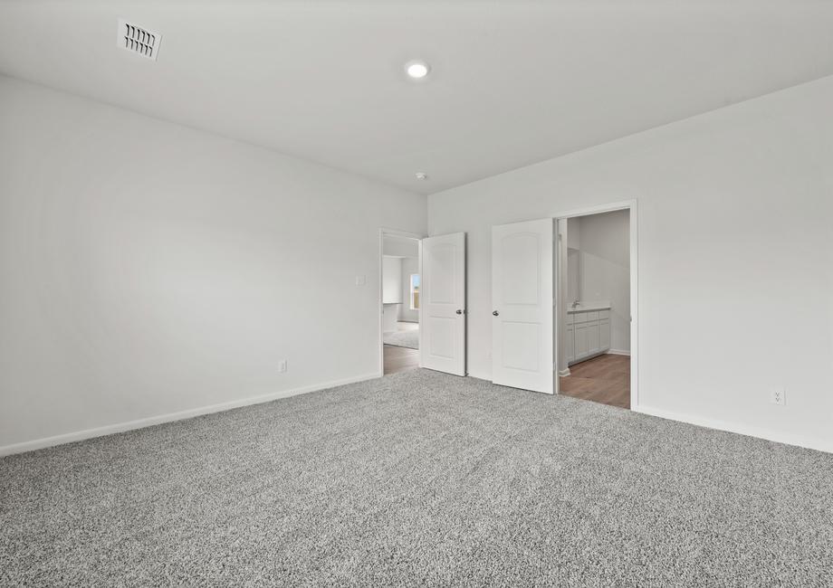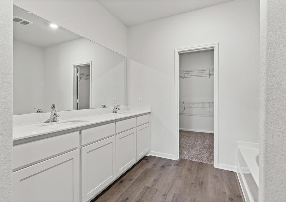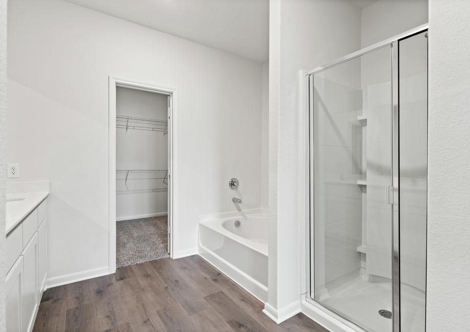 The master suite of the Cypress floor plan provides a great space for owners to retreat to. With plenty of space for furniture, a private bathroom and a large walk-in closet, this space provides the perfect place for you to relax. The spa-like bathroom includes a giant soaker tub, walk-in glass shower and plenty of vanity space with double sinks.