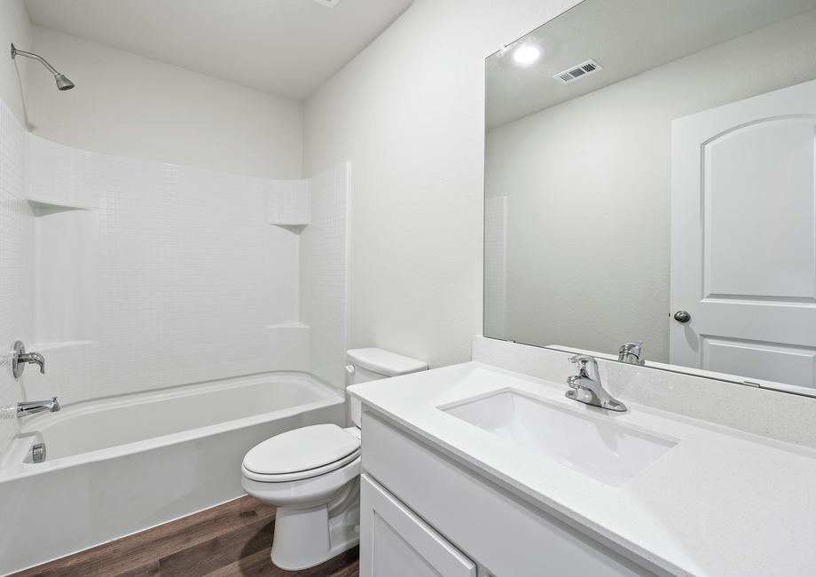 The master suite in this home is the perfect place to relax and unwind after a busy day. Tucked away from the other bedrooms in the home, this space gives you the privacy that you need. The bedroom in this floor plan was built to fit all of your king-sized furniture. It also has a window with an exclusive view to the fully fenced back yard. The master bathroom has great vanity space and a large glass shower. The walk-in closet provides plenty of space to store your clothes and other personal items.