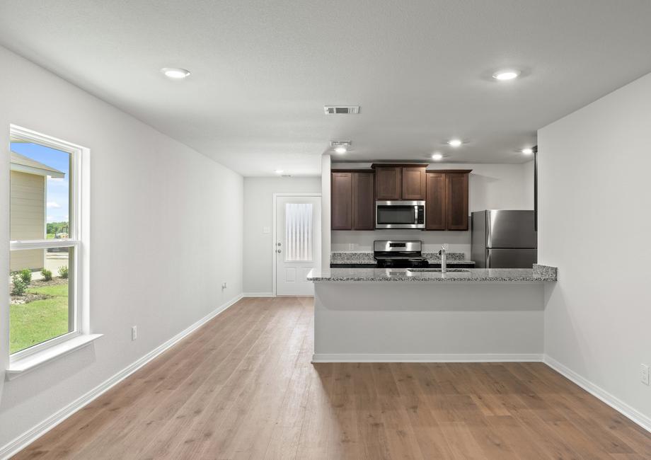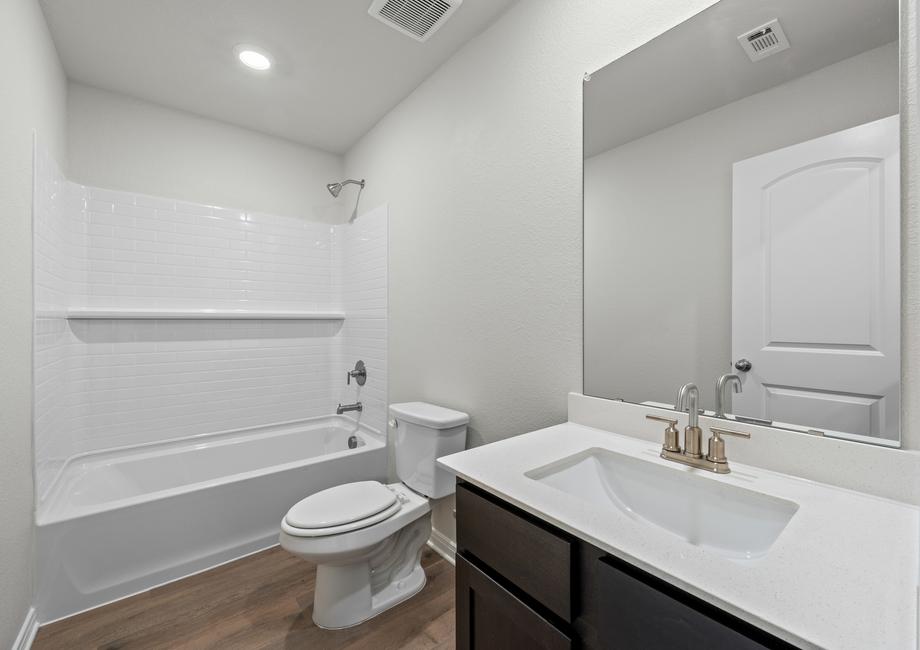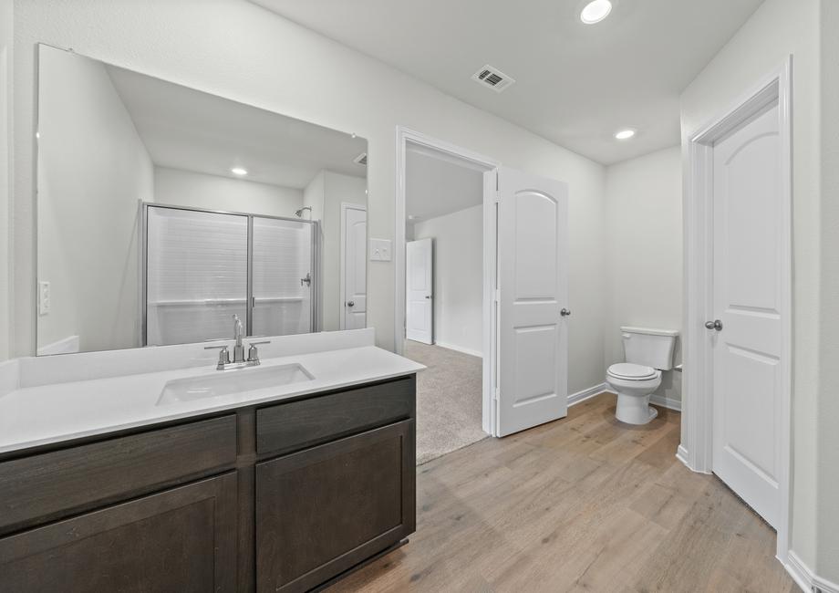The Cedar floor plan offers homeowners a plethora of upgrades at no additional cost. From gorgeous granite countertops to designer wood cabinetry and luxurious vinyl plank flooring, every detail exudes sophistication and style. With modern conveniences such as a Wi-Fi-enabled garage door opener and programmable thermostat included, the Cedar epitomizes upgraded living.