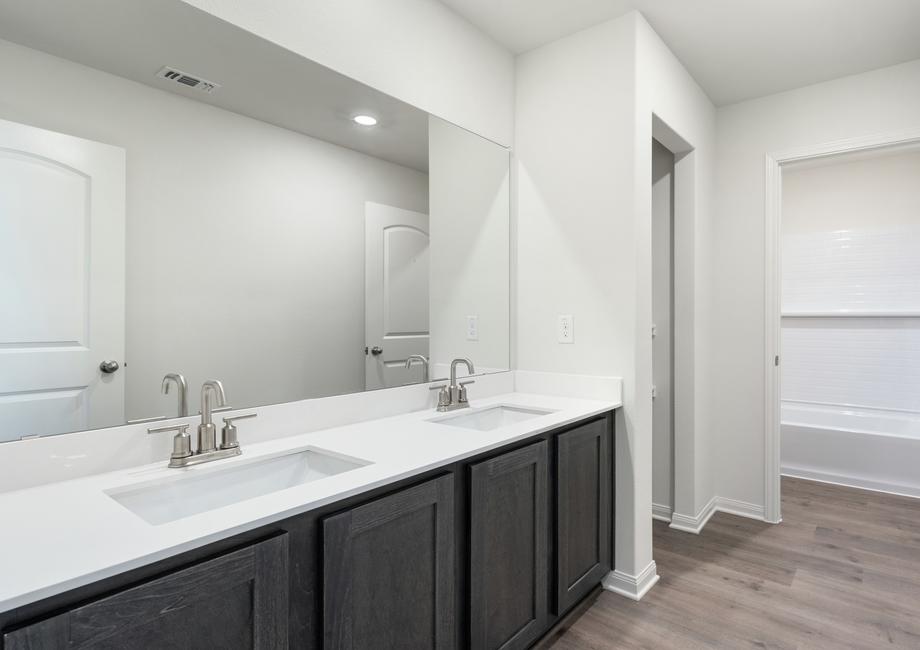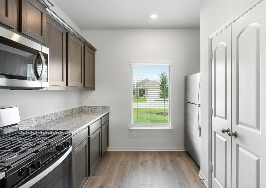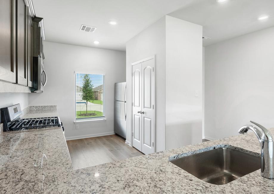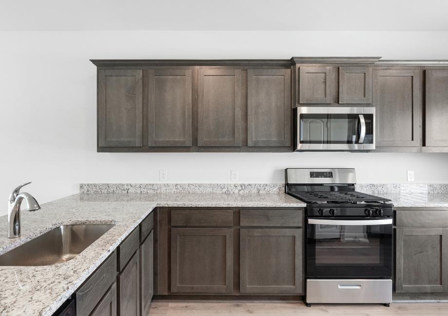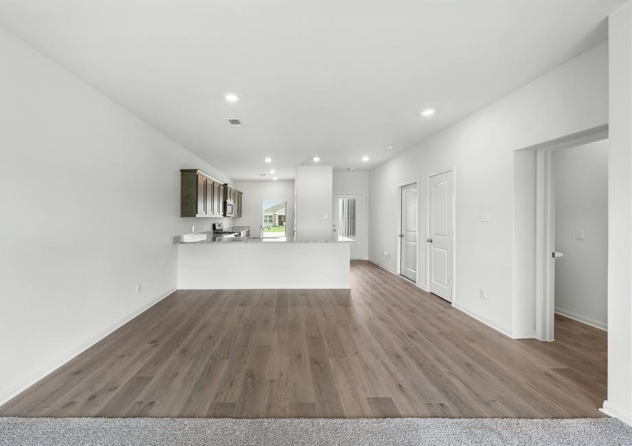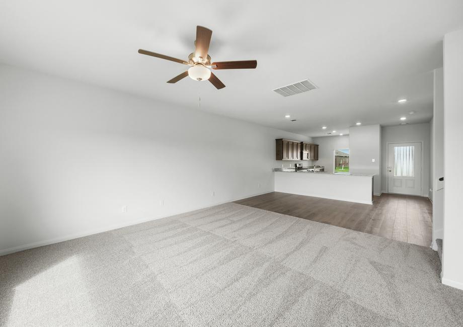 The living room in the Cottonwood is a welcoming space designed for gathering with friends and family. Its open layout, connected to the kitchen and dining area, allows you to stay part of the fun even while tending to meals or refreshments. Whether enjoying everyday family moments or hosting lively celebrations, this home is built with connection and togetherness in mind.