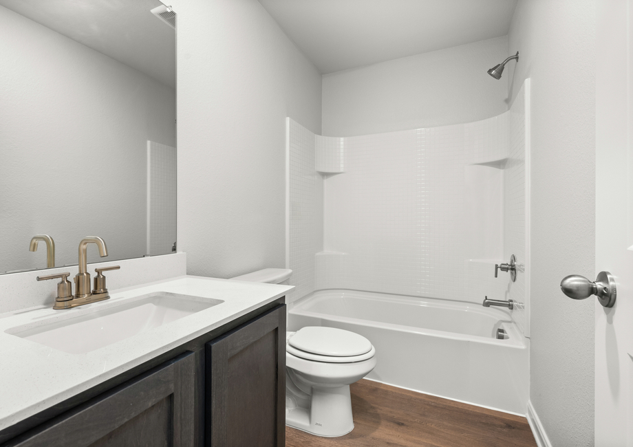 Crafted with your comfort in mind, the expansive master suite of the Rio Grande floor plan features a generously sized bedroom, a private bathroom and a sizable walk-in closet. Sunlight pours in, creating an inviting, airy ambiance. The private bathroom features a roomy vanity area and a luxurious tub-shower combination. Additionally, the walk-in closet is thoughtfully designed with shelves and ample hanging space to accommodate all your clothing storage needs.